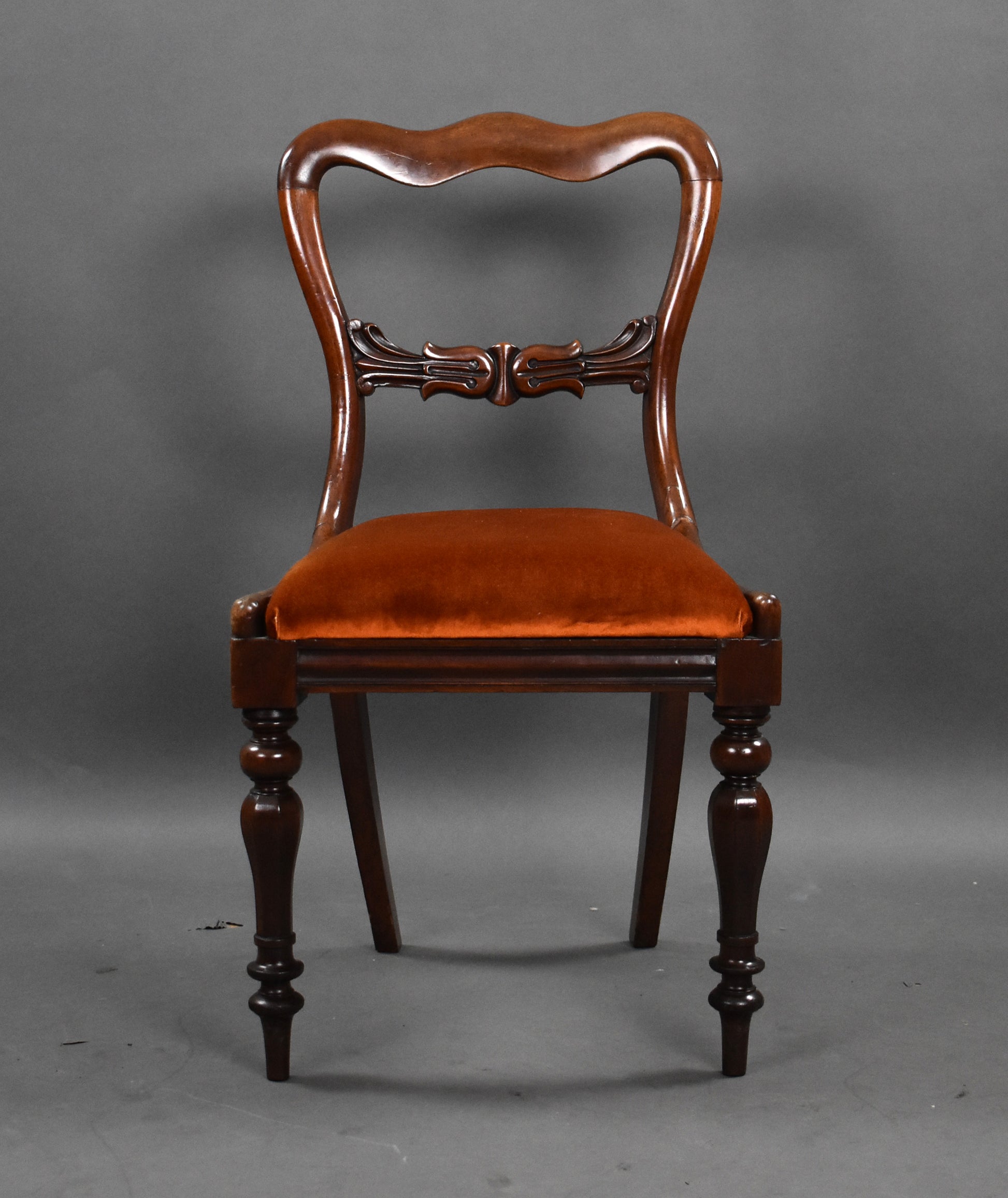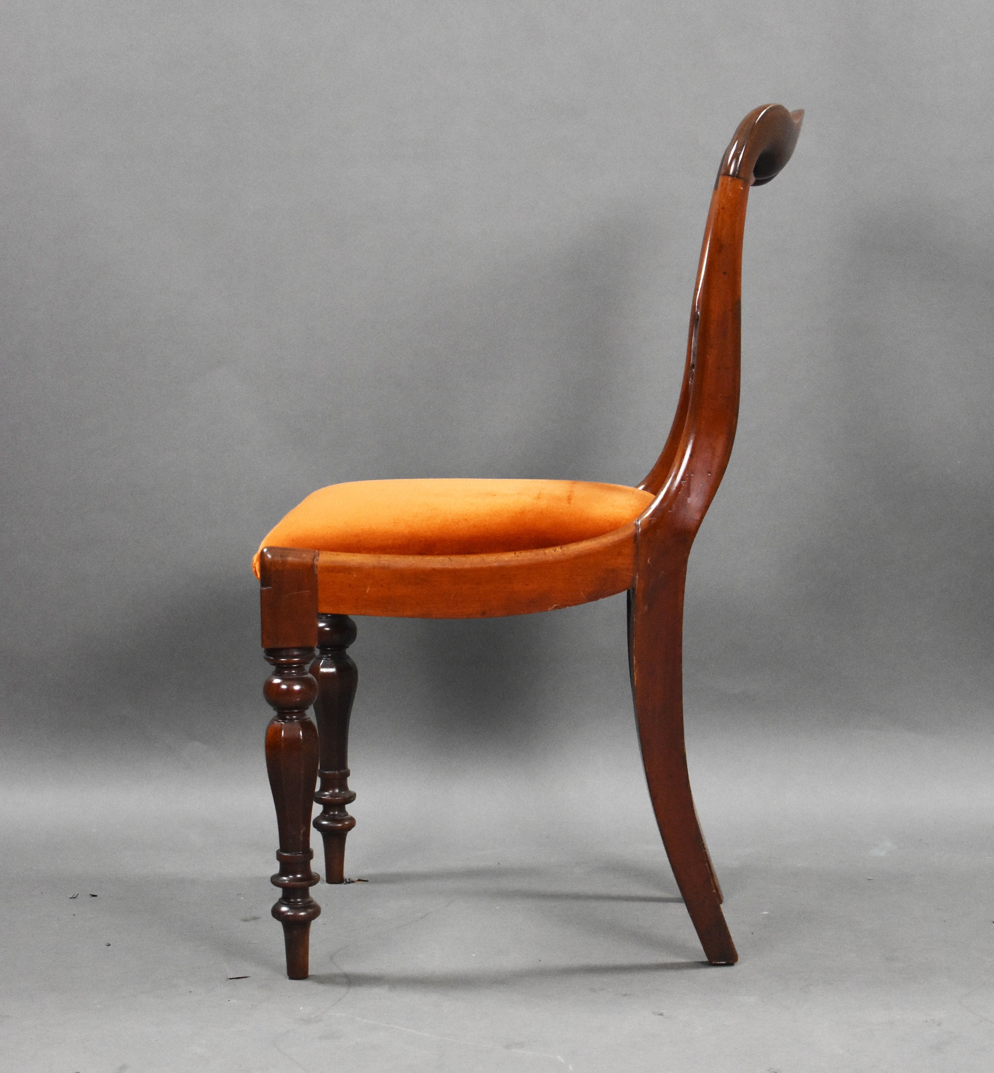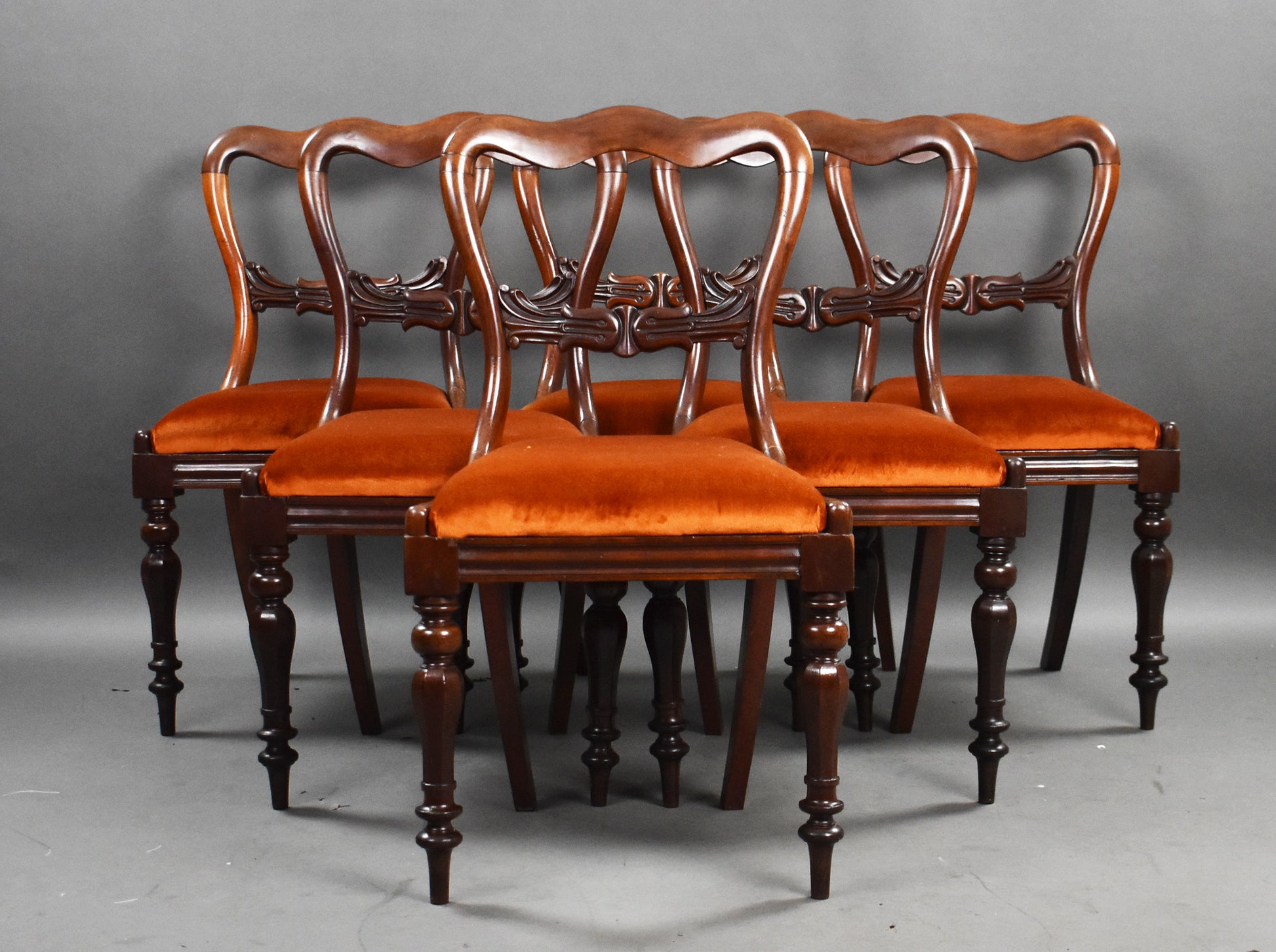 Set six 19th Century mahogany dining chairs with bar back and turned legs with drop in seats upholstered in a rust orange velevet fabric.