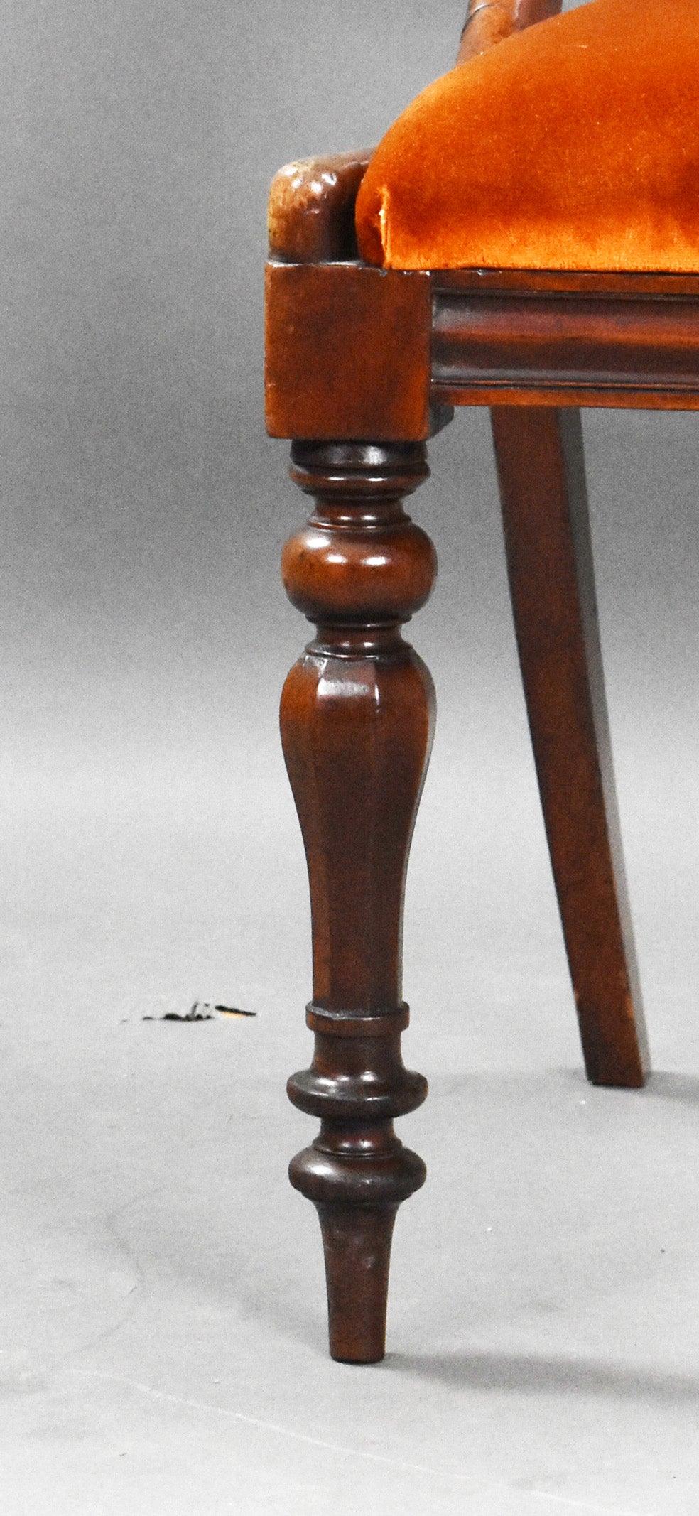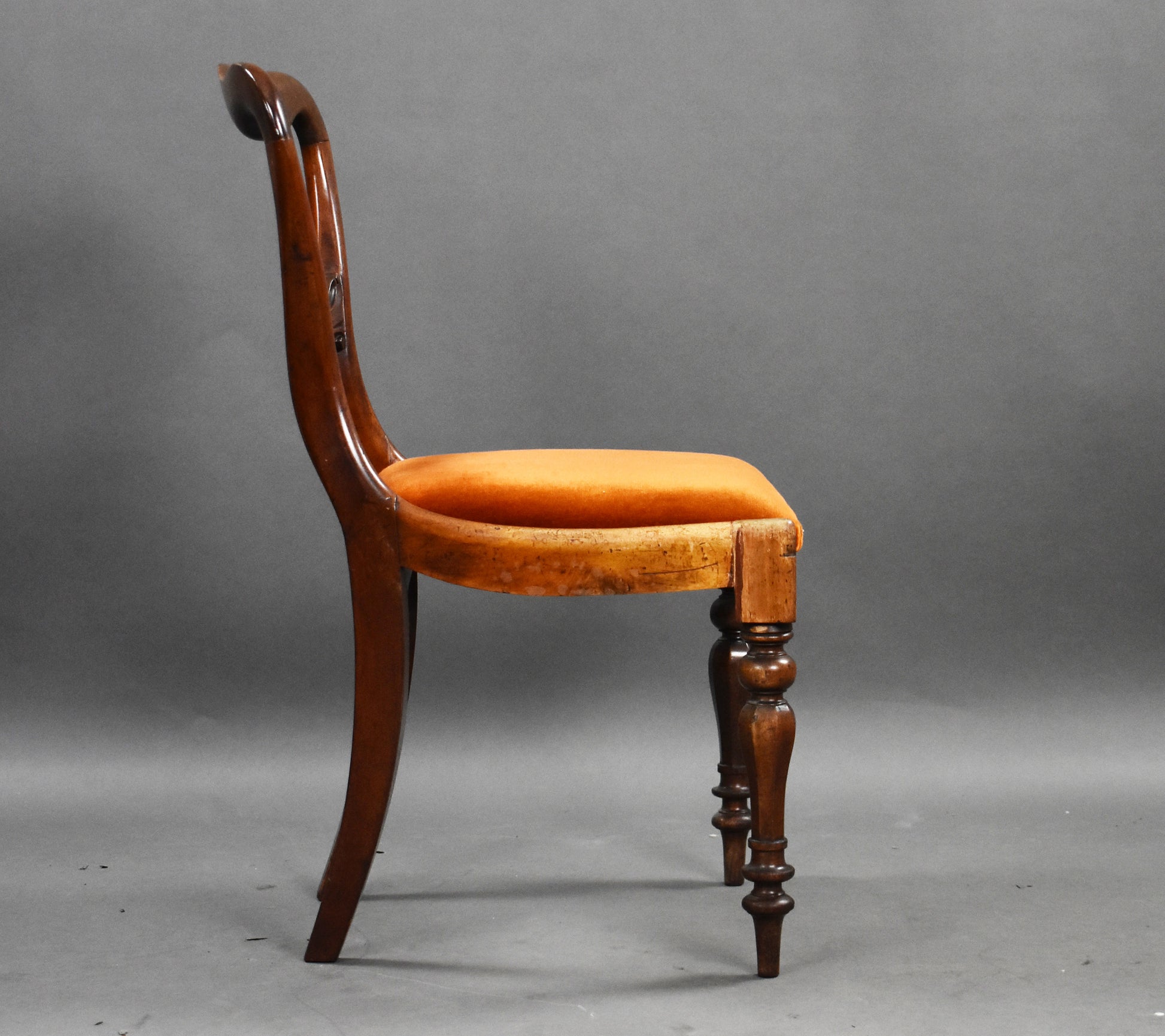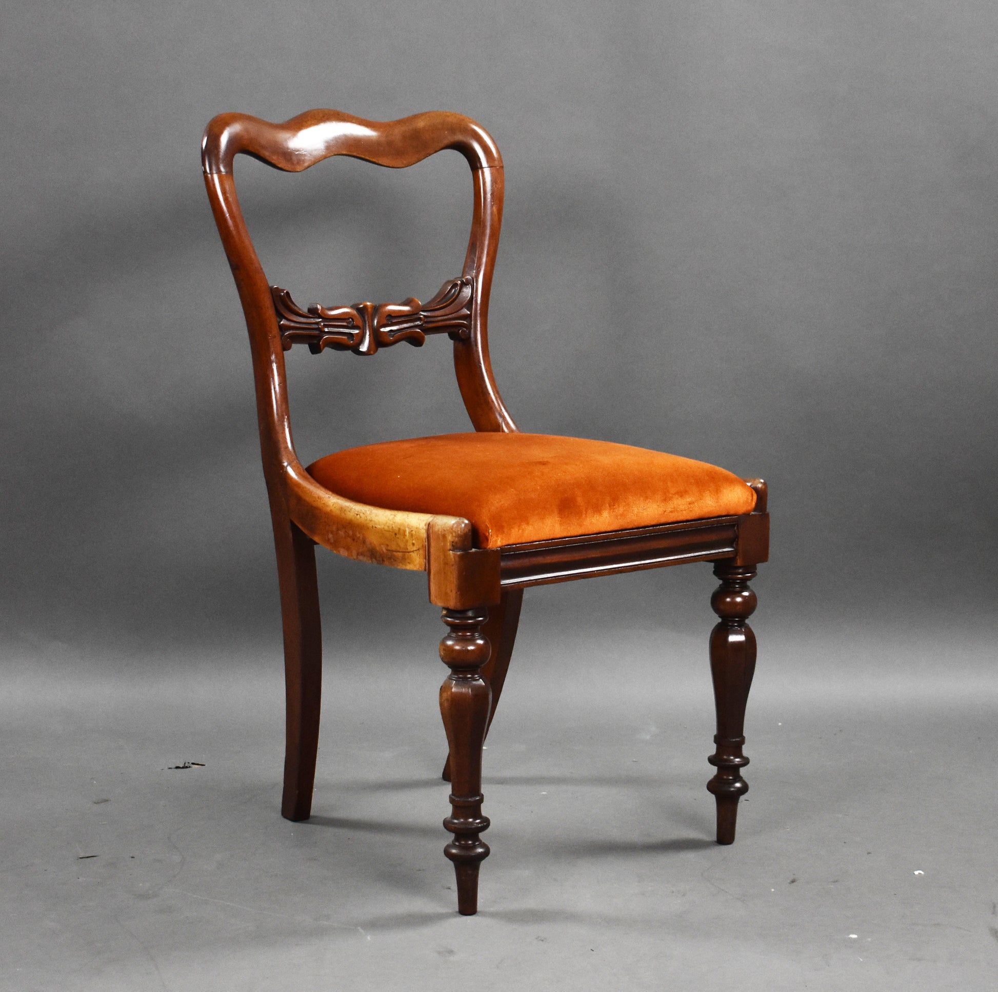 Set six 19th Century mahogany dining chairs with bar back and turned legs with drop in seats upholstered in a rust orange velevet fabric.