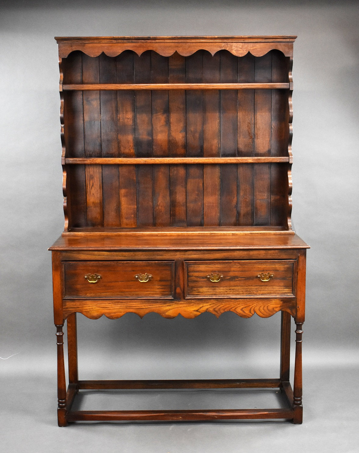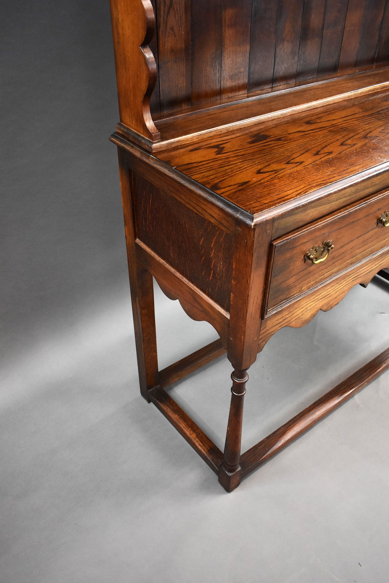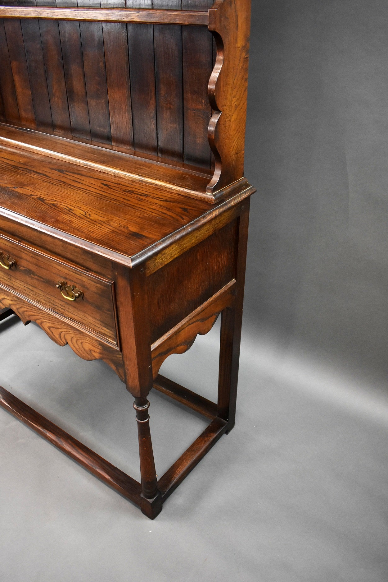 This is a small solid oak open rack dresser in good condition with two shelves to display plates and cups etc. Below has two drawers one of the drawers is fitted so cutlery etc can be stored, the dresser stands on stretcher base.