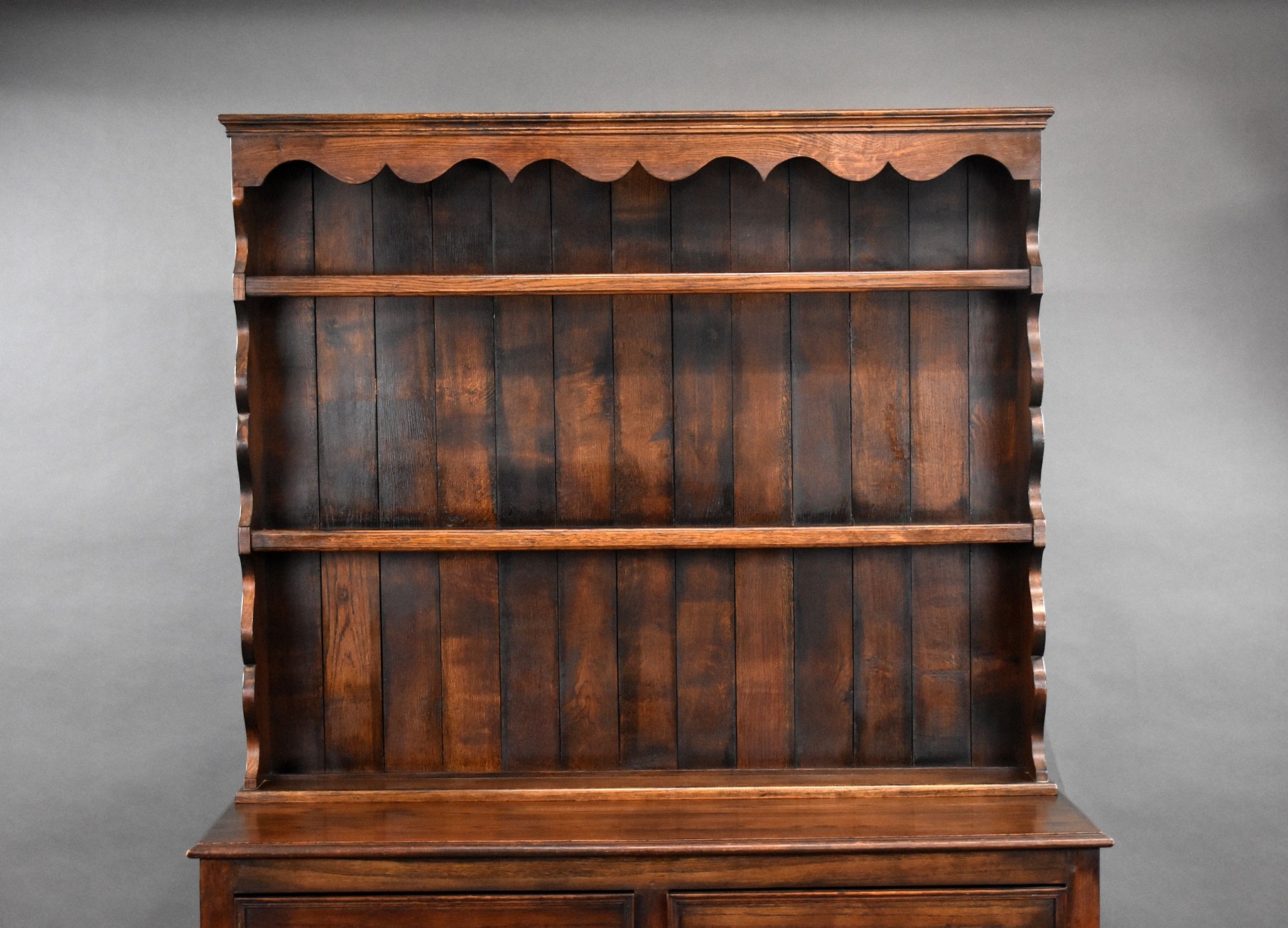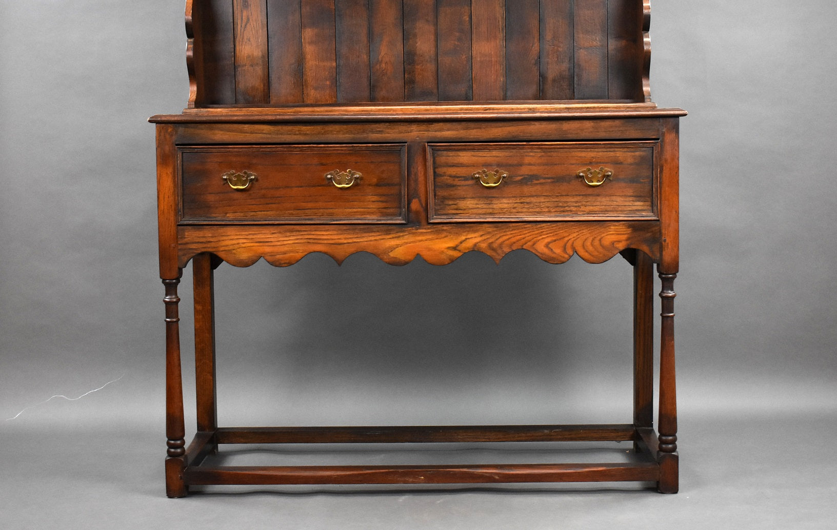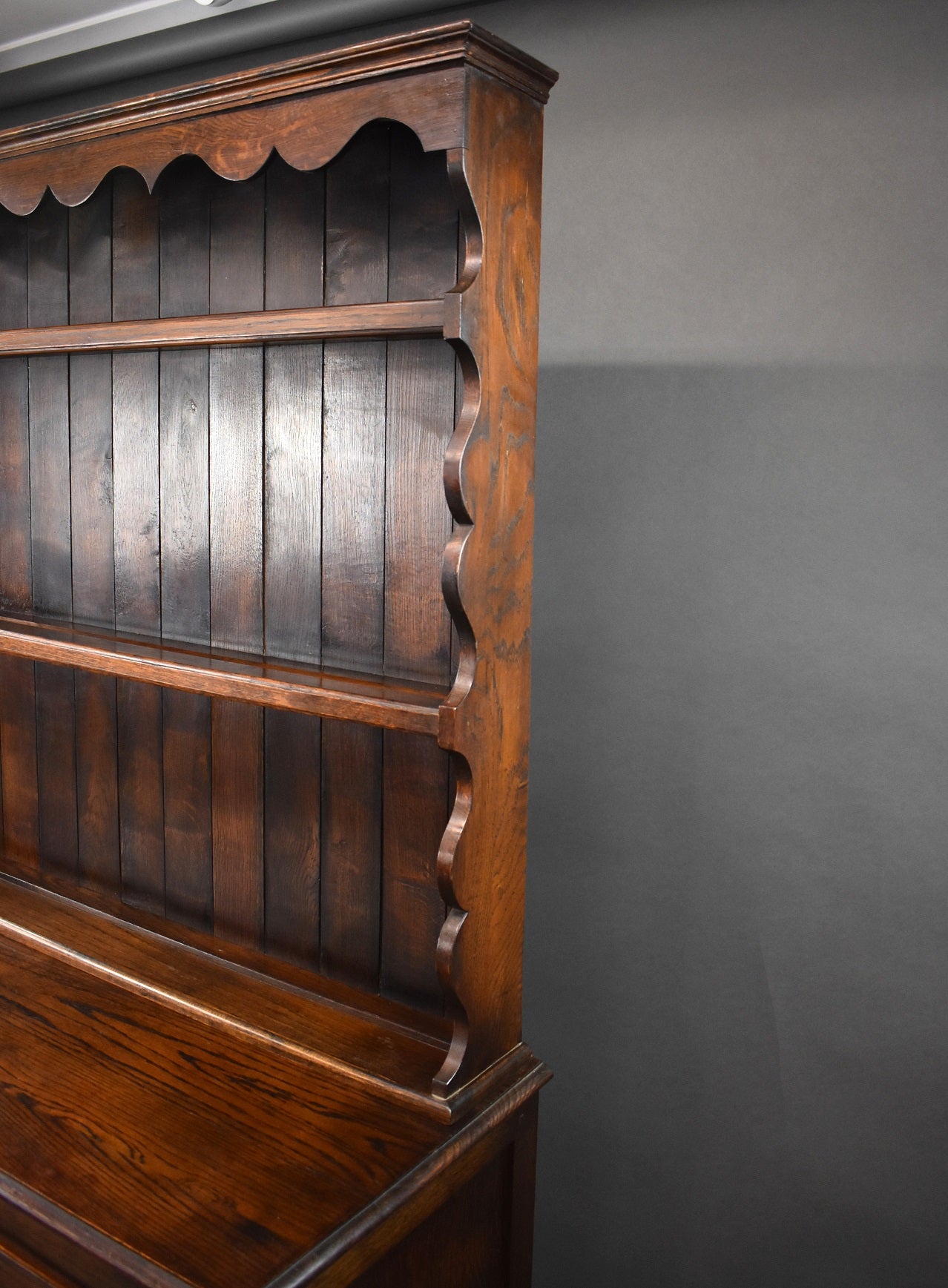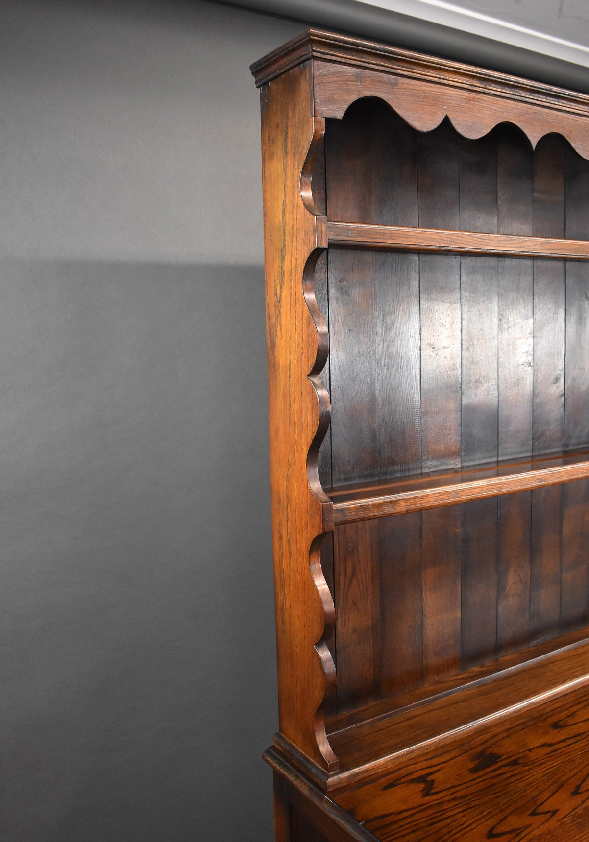This is a small solid oak open rack dresser in good condition with two shelves to display plates and cups etc. Below has two drawers one of the drawers is fitted so cutlery etc can be stored, the dresser stands on stretcher base.