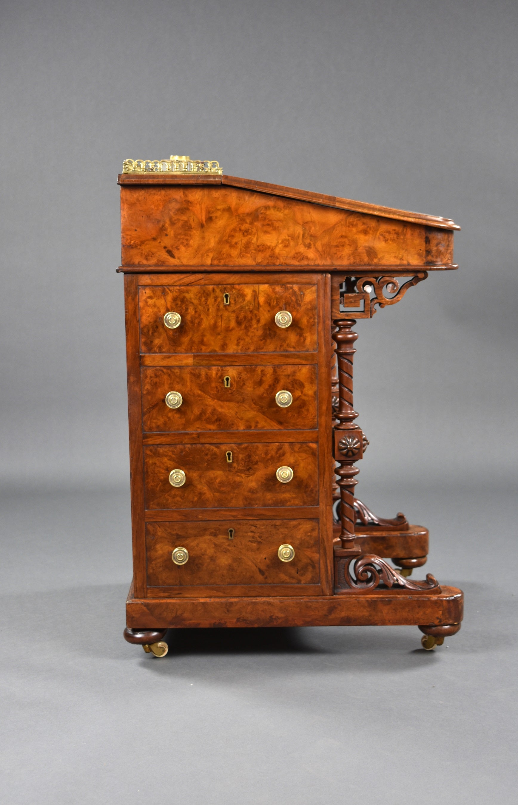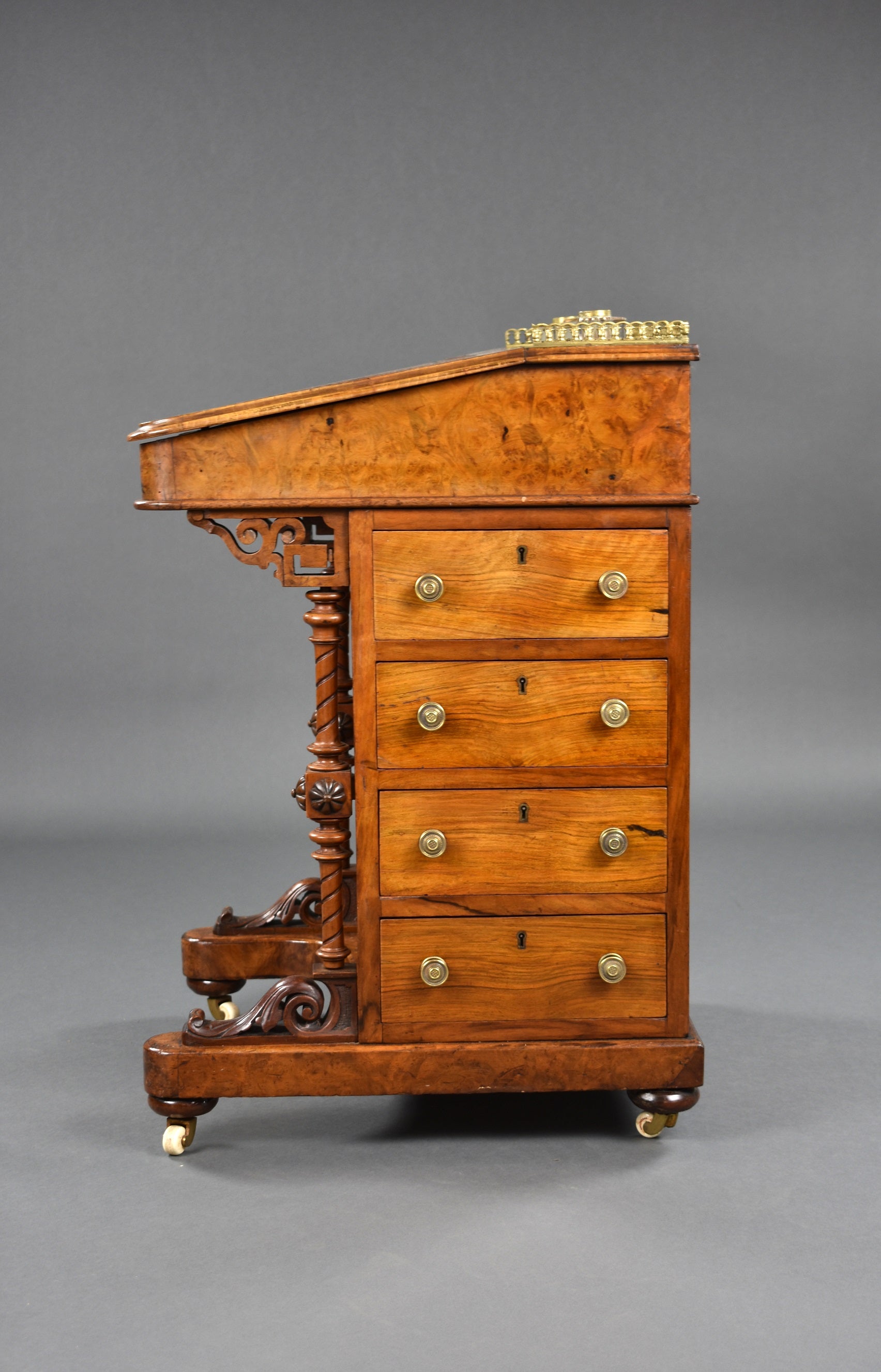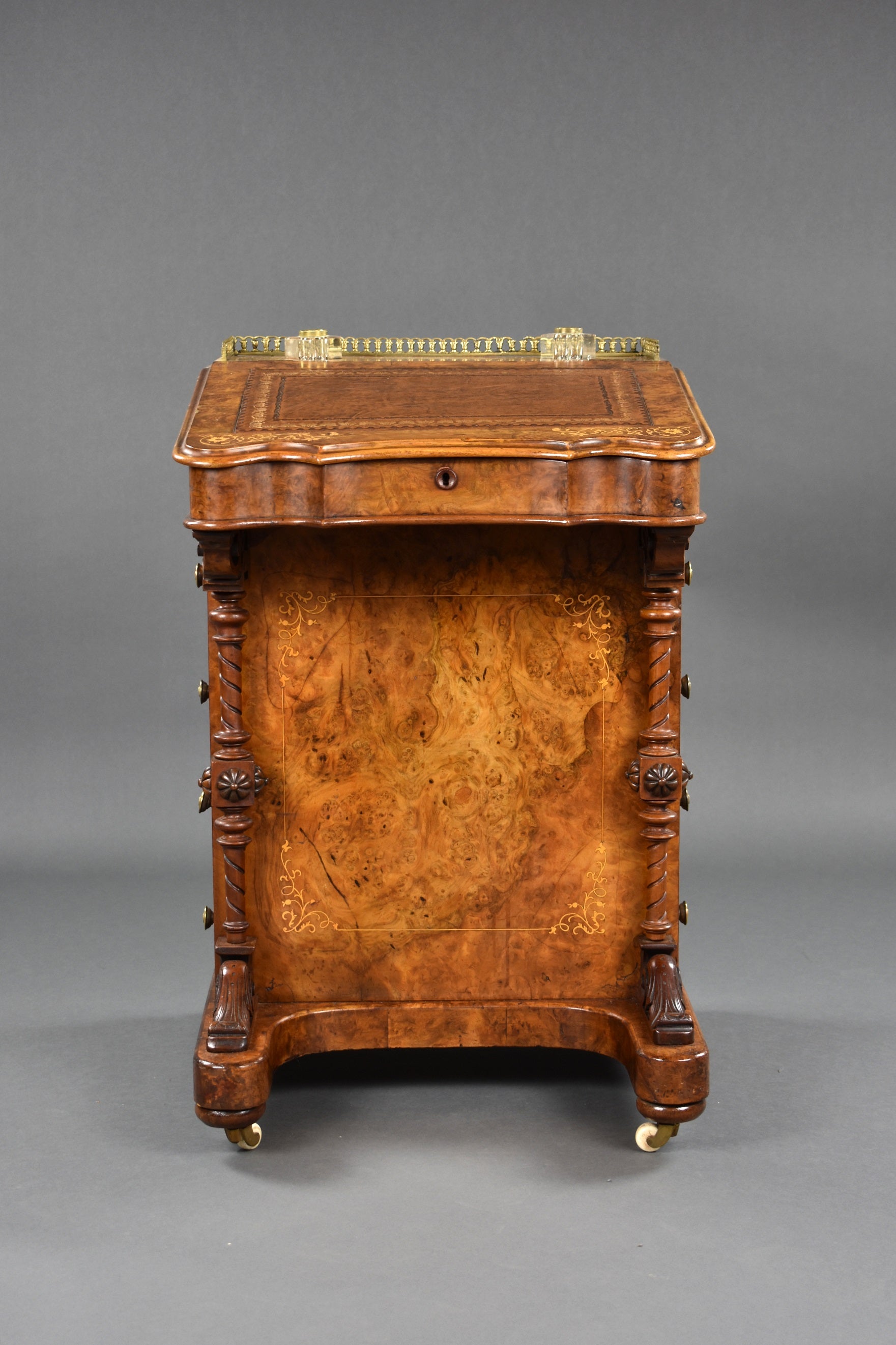 Victorian burr walnut and inlaid davenport in nice condition. It has a brass gallery to the top with an an ink well either side with decorative inlay surrounding each. The top has a tan leather insert with gold tooling to the edge, the top lifts up to reveal satinwood interior with two small drawers to the centre and pigeon holes either side. Inlay to the front with ornately carved columns either side. The left side has dummy drawers and the apposing side has functional drawers with brass handles, the davenport stands on castors.