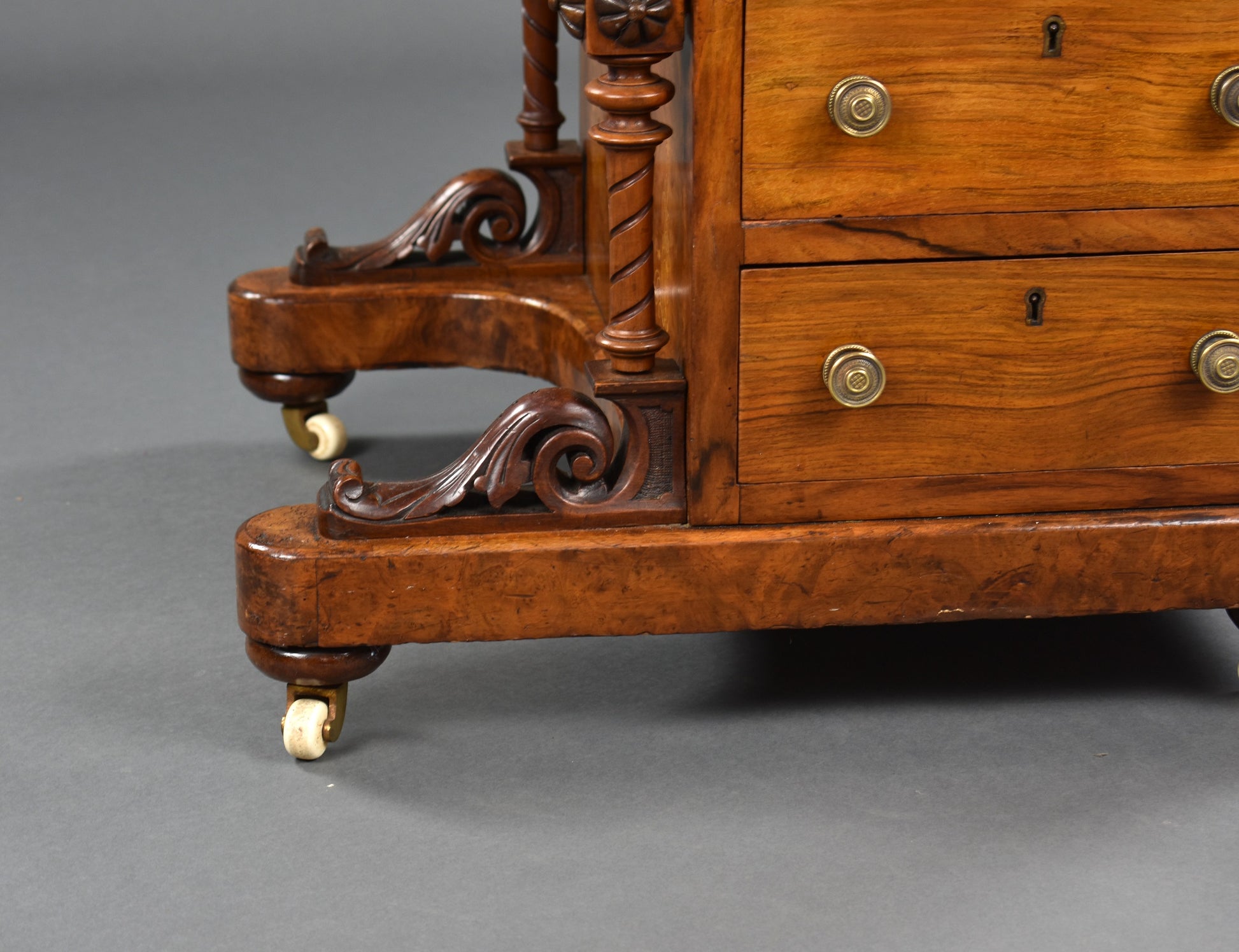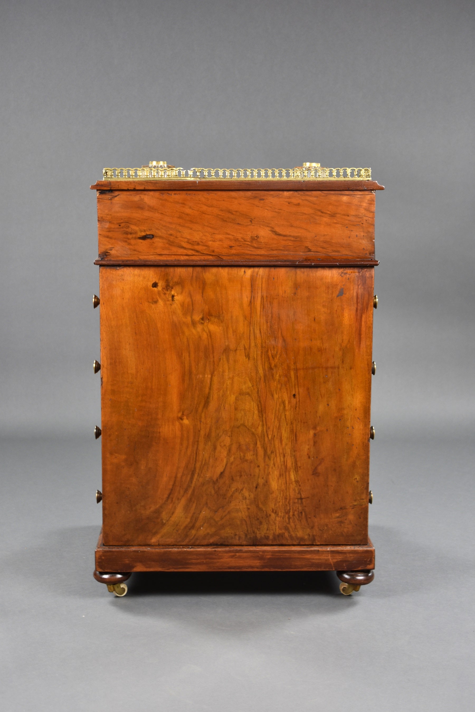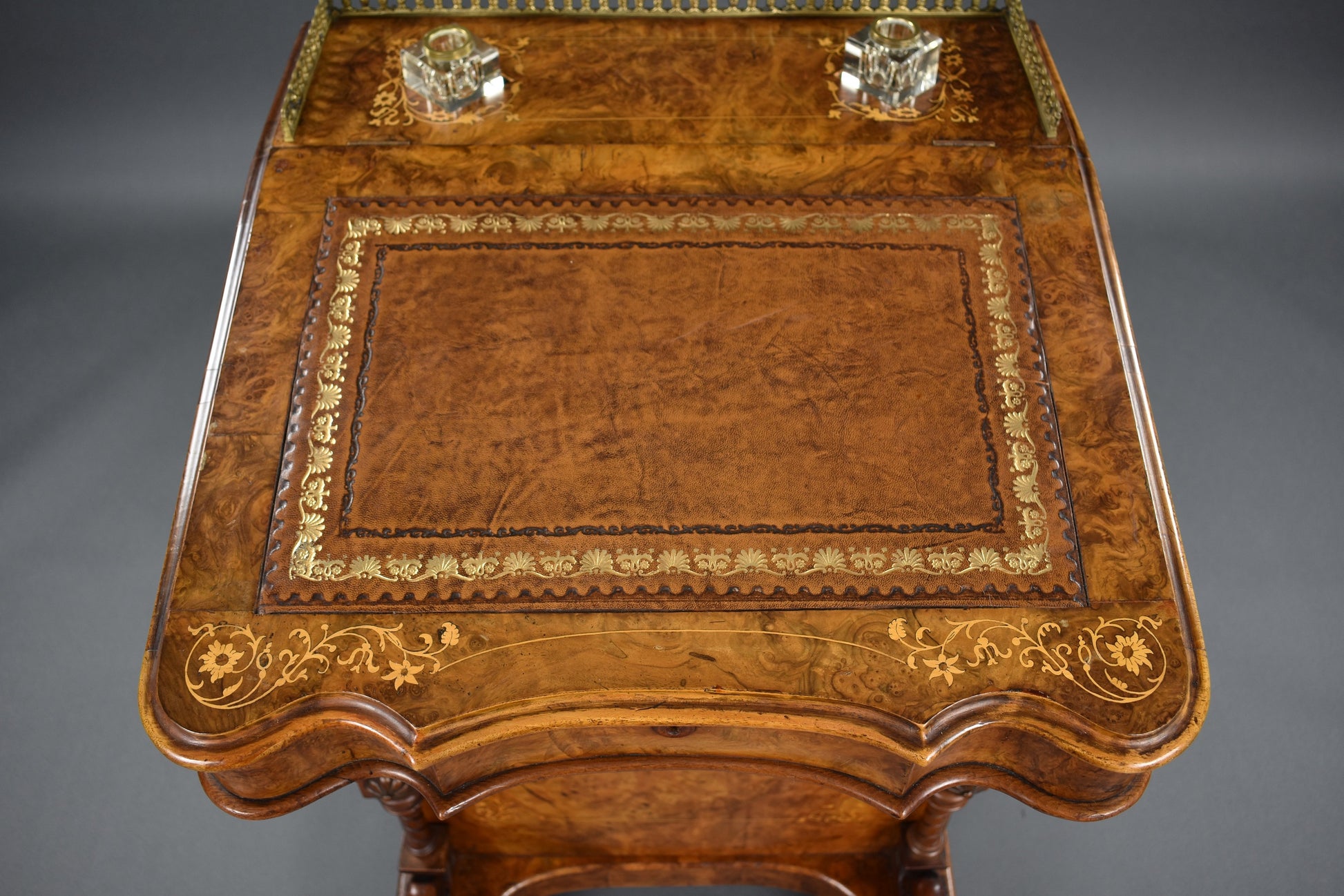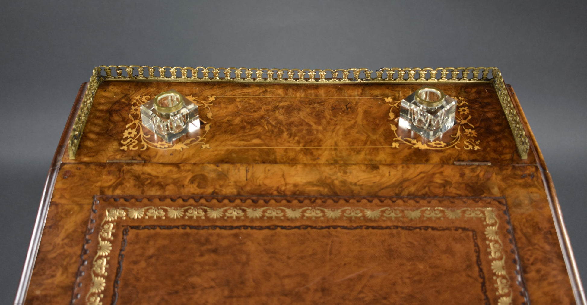 Victorian burr walnut and inlaid davenport in nice condition. It has a brass gallery to the top with an an ink well either side with decorative inlay surrounding each. The top has a tan leather insert with gold tooling to the edge, the top lifts up to reveal satinwood interior with two small drawers to the centre and pigeon holes either side. Inlay to the front with ornately carved columns either side. The left side has dummy drawers and the apposing side has functional drawers with brass handles, the davenport stands on castors.