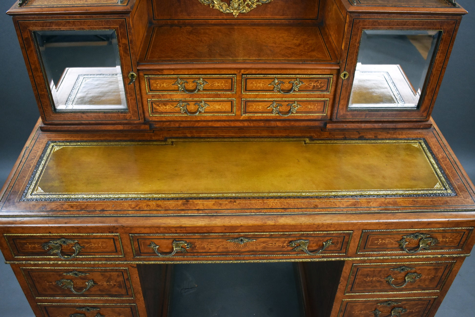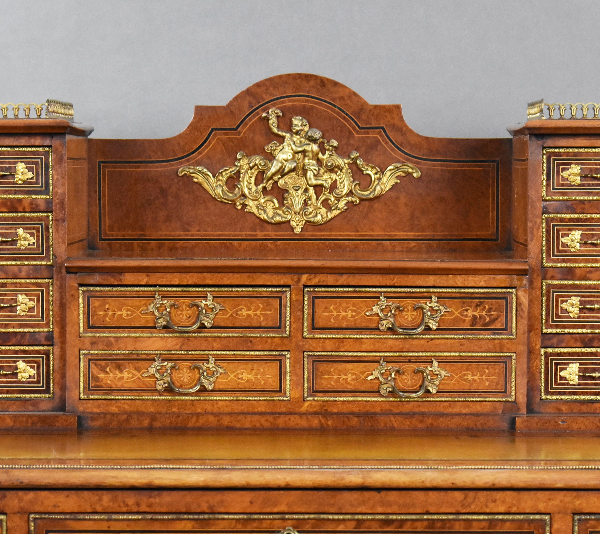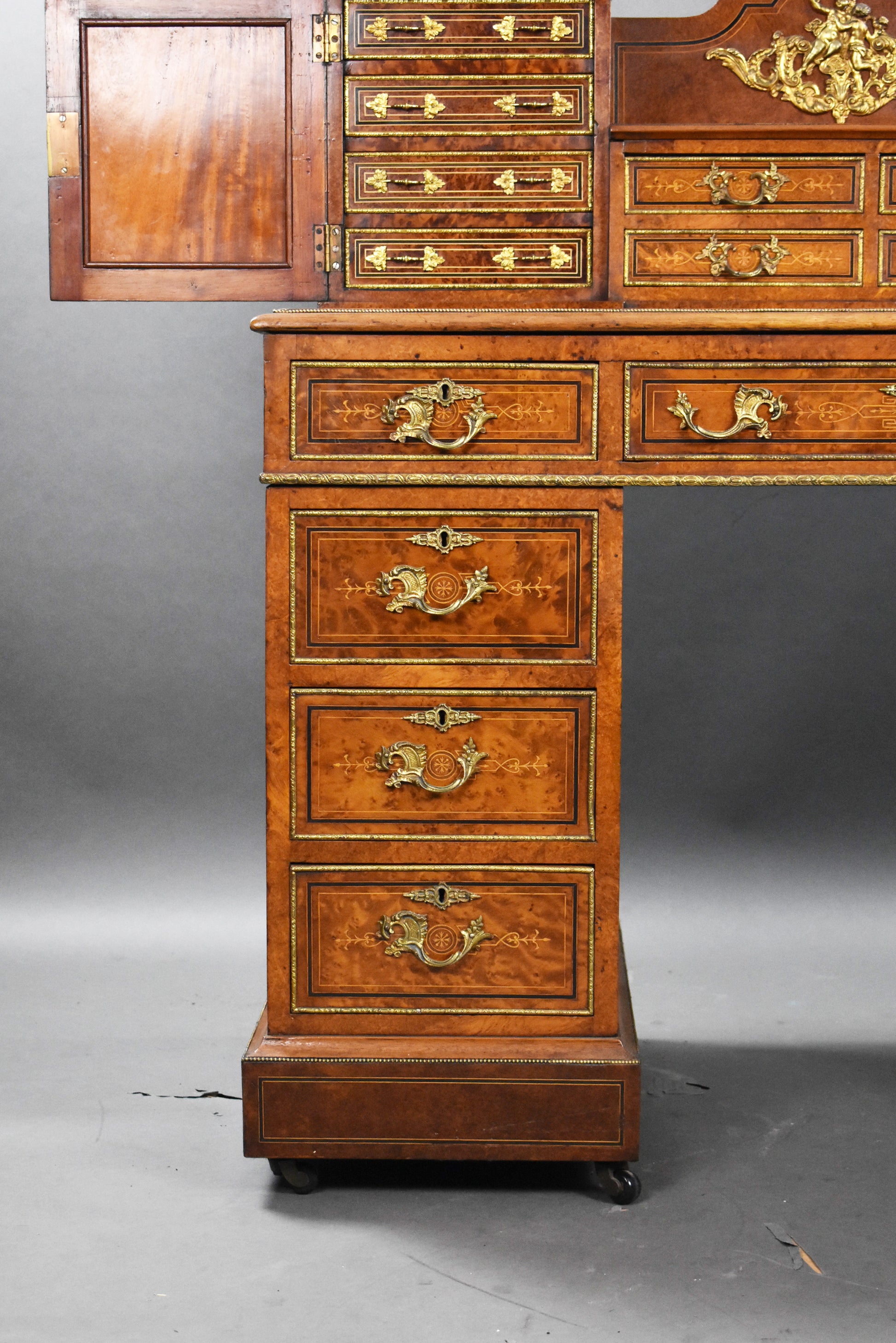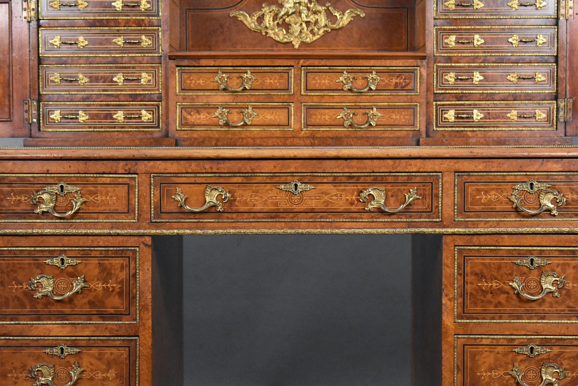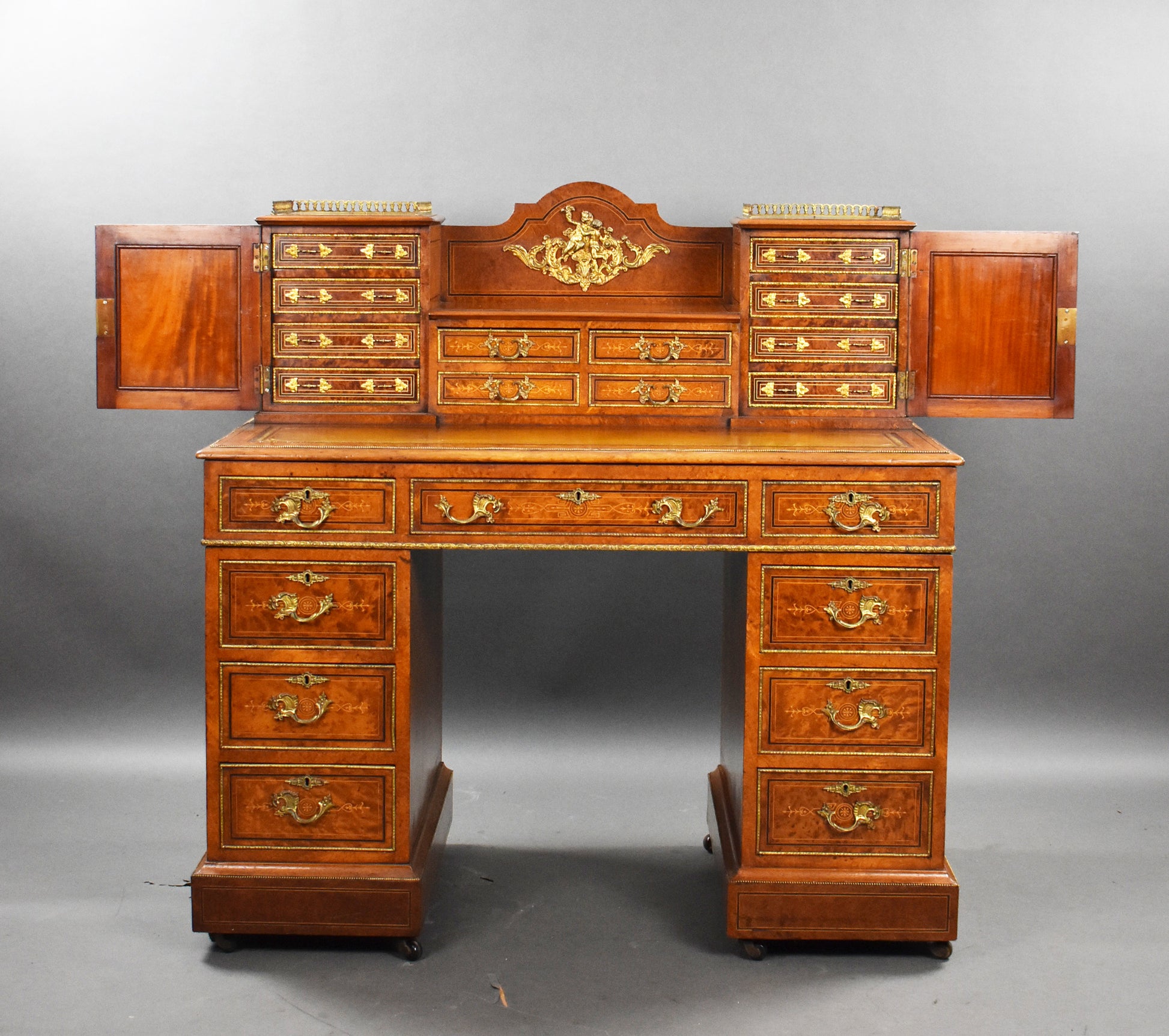 An outstanding 19th-century Victorian burr walnut pedestal desk of rare form and exceptional craftsmanship, featuring a richly detailed superstructure with an array of drawers and cabinets. This imposing piece combines function with decorative elegance, boasting intricate marquetry, fine gilt-bronze (ormolu) mounts, and a wealth of storage throughout.