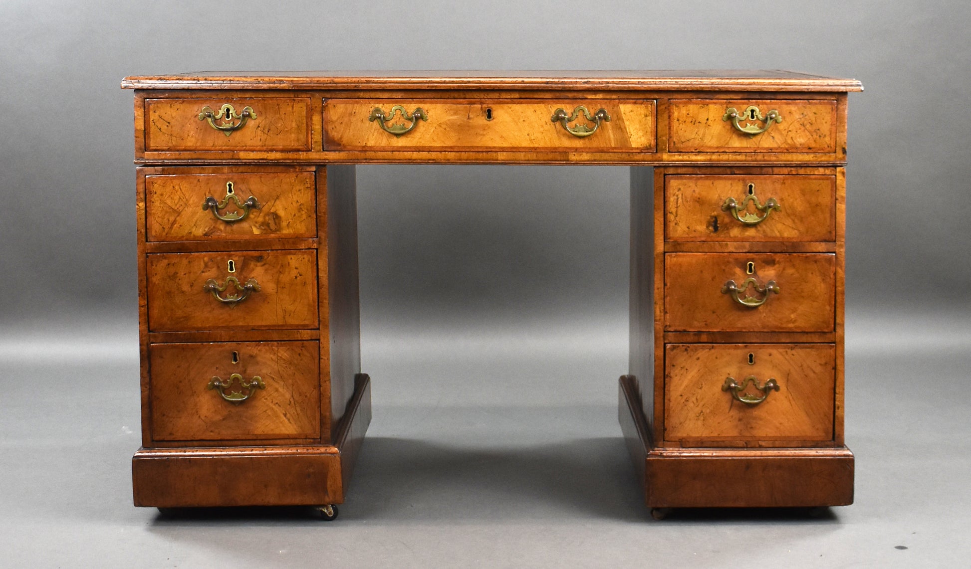 Victorian Figured walnut pedestal desk, the desk has a tan leather top with three drawers underneath, each pedestal has three drawers all with brass handles, there are dummy drawers to the back of the desk making it freestanding.