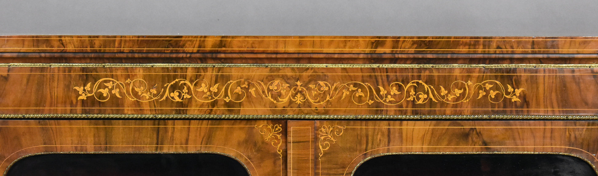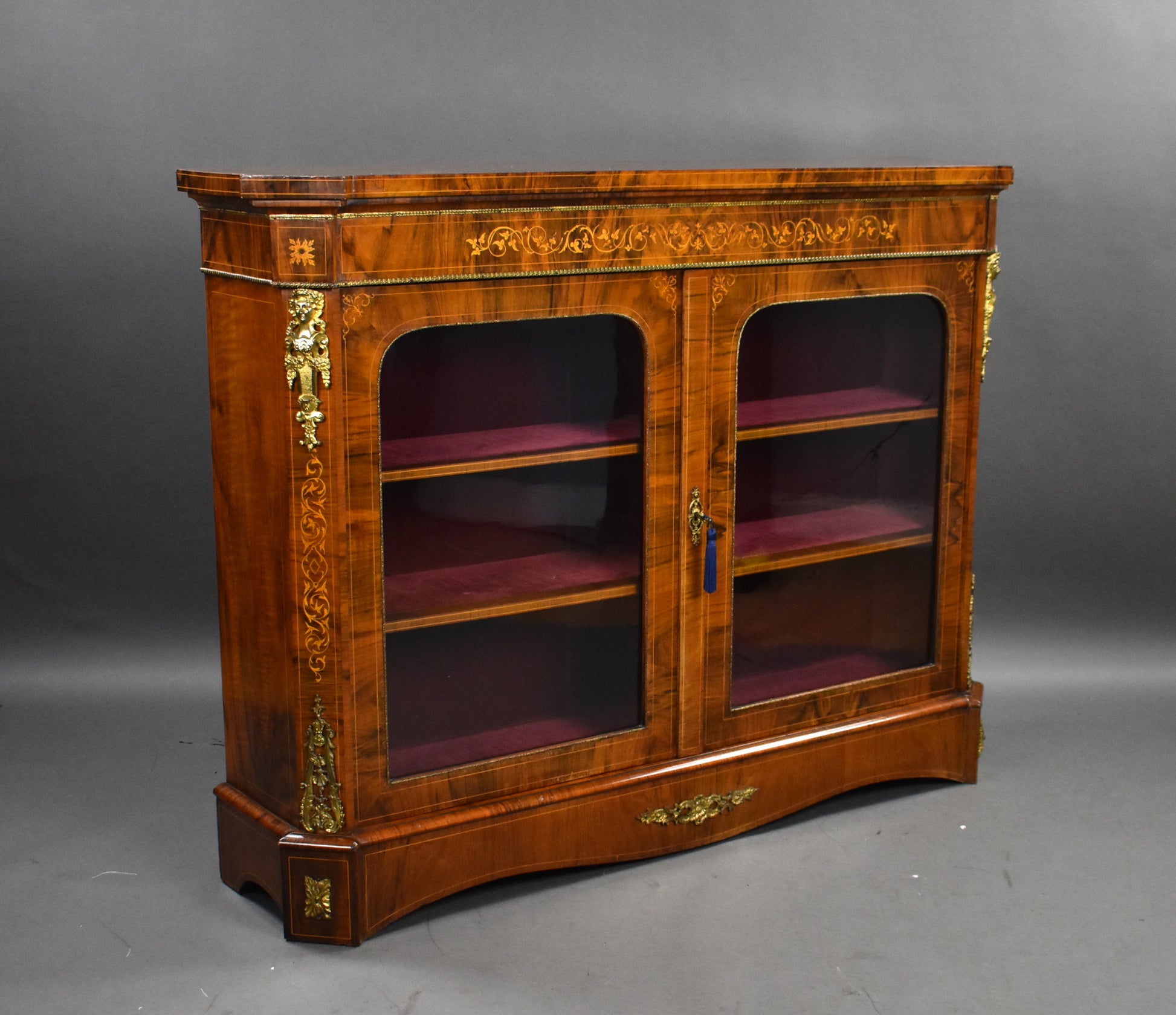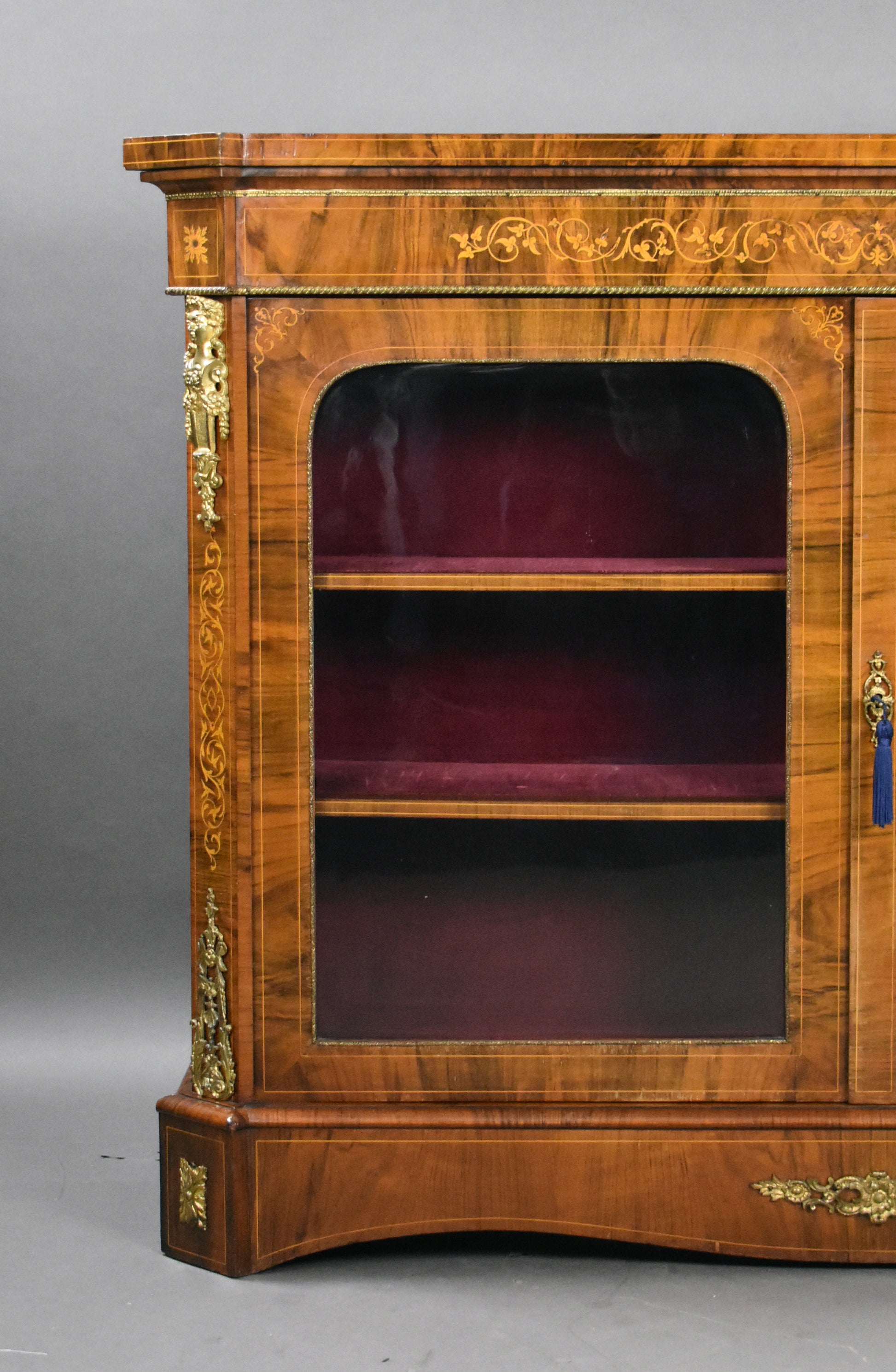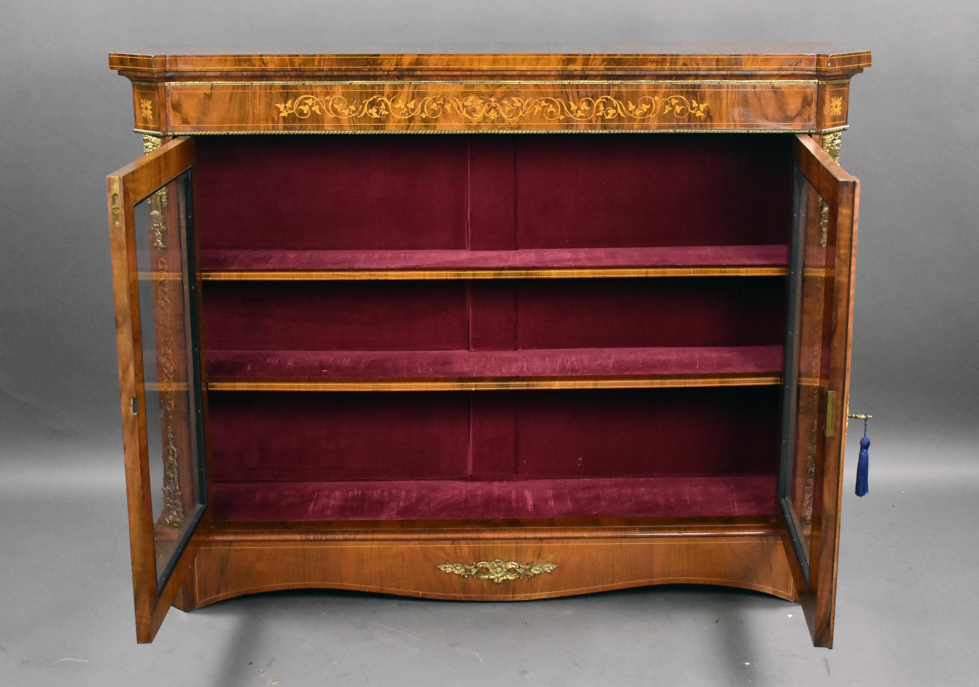 Victorian Inlaid Walnut Pier cabinet with adjustable shelves enclosed by a pair arched glazed doors and with gilt mounts throughout.