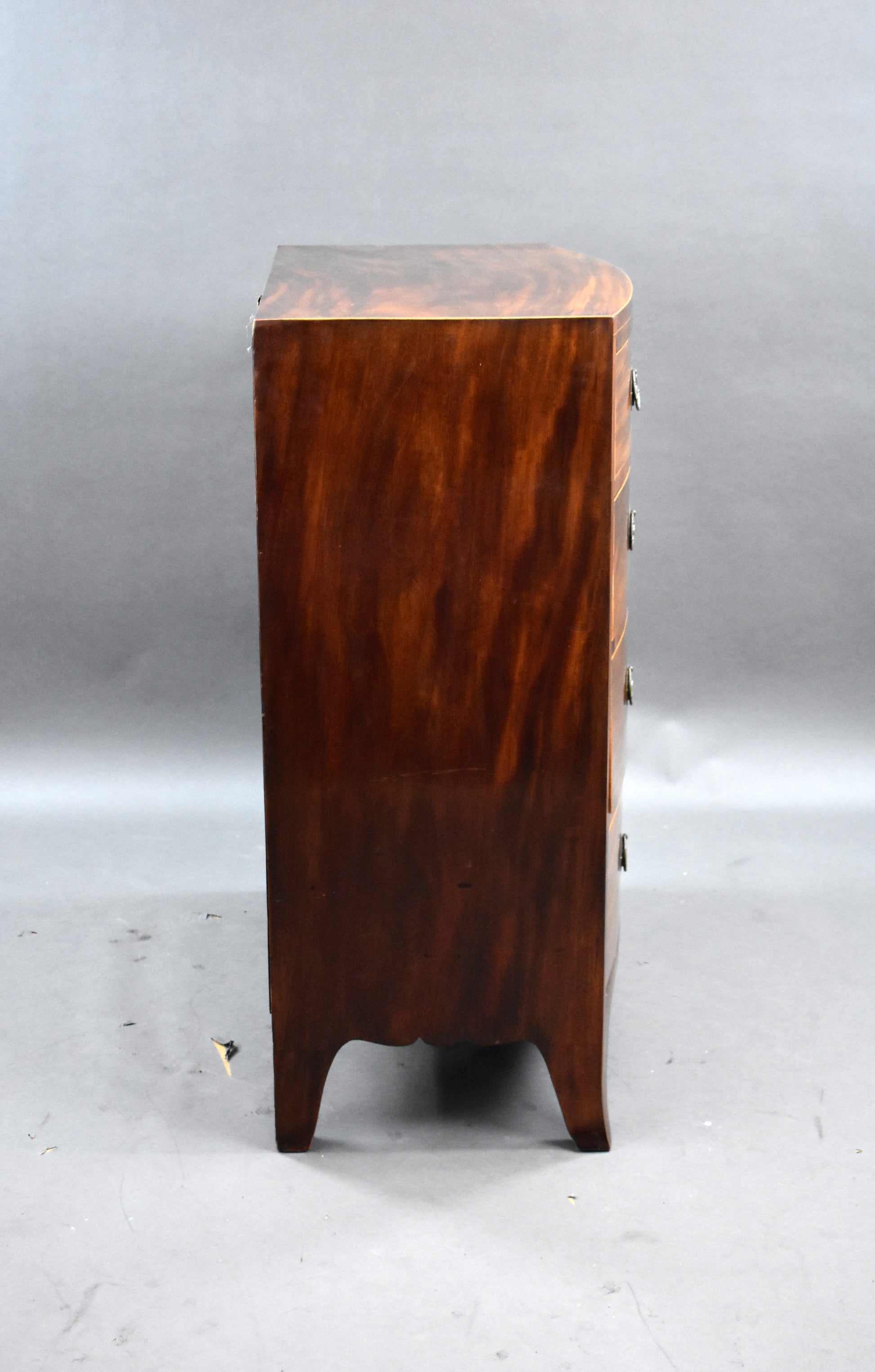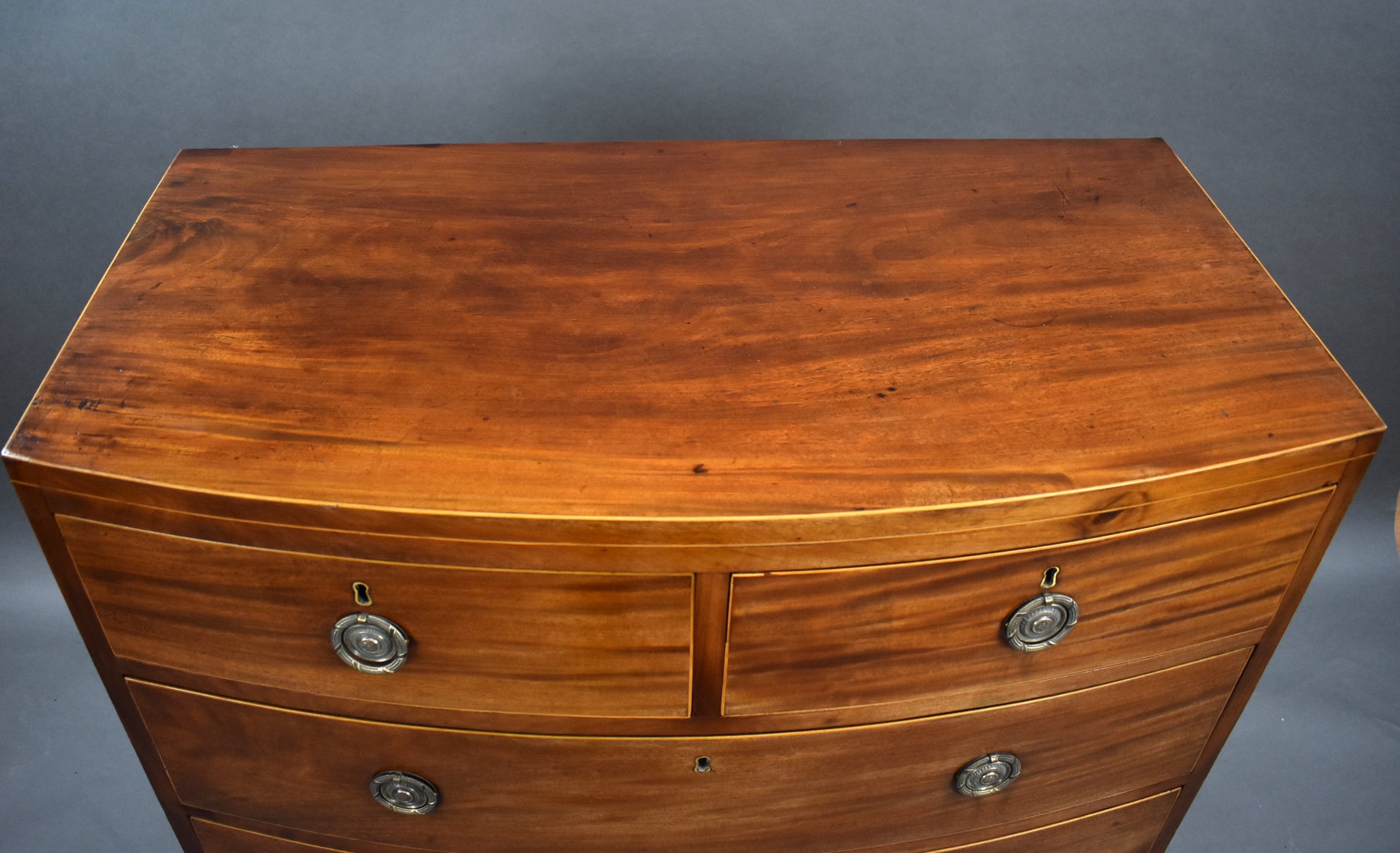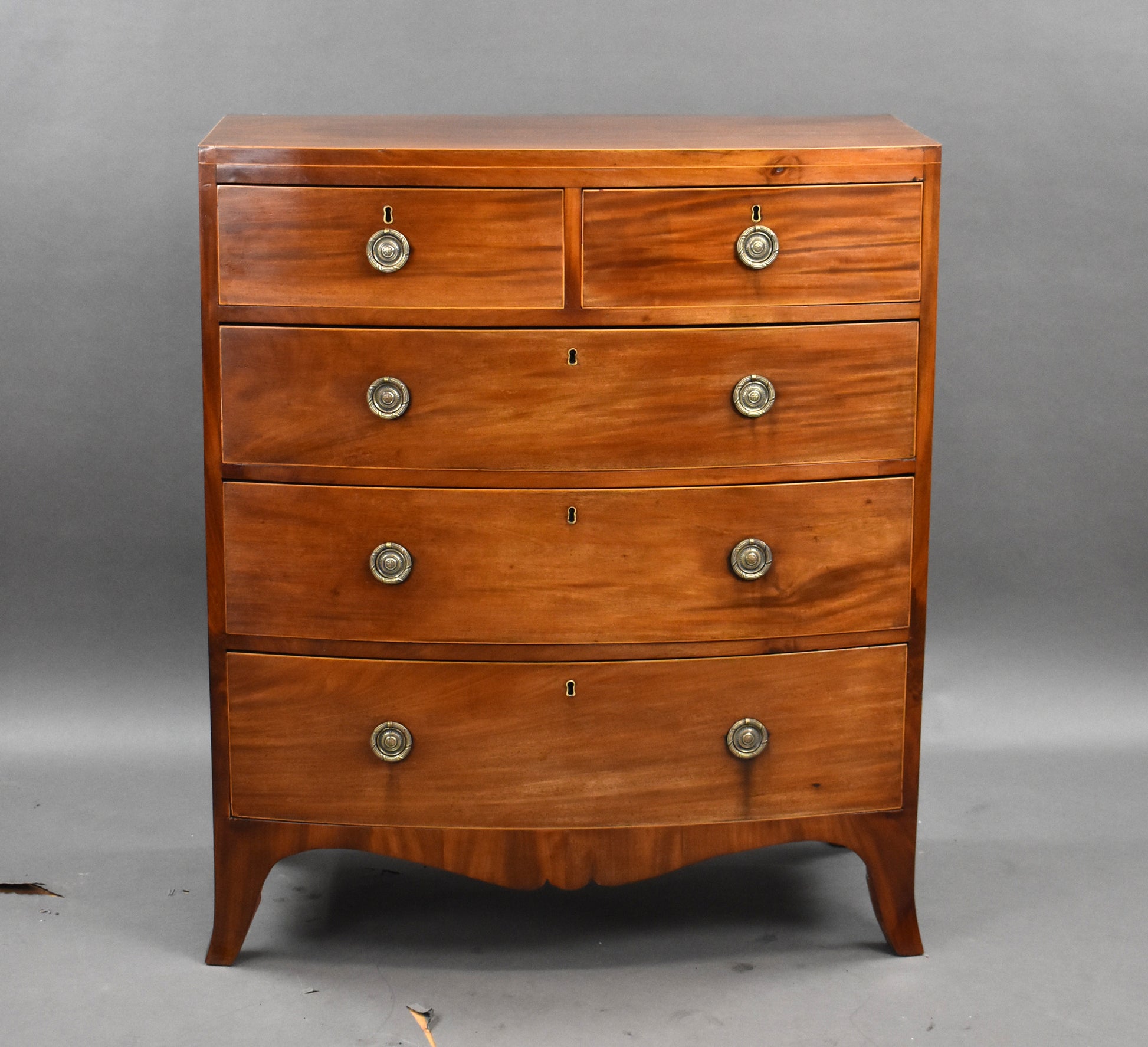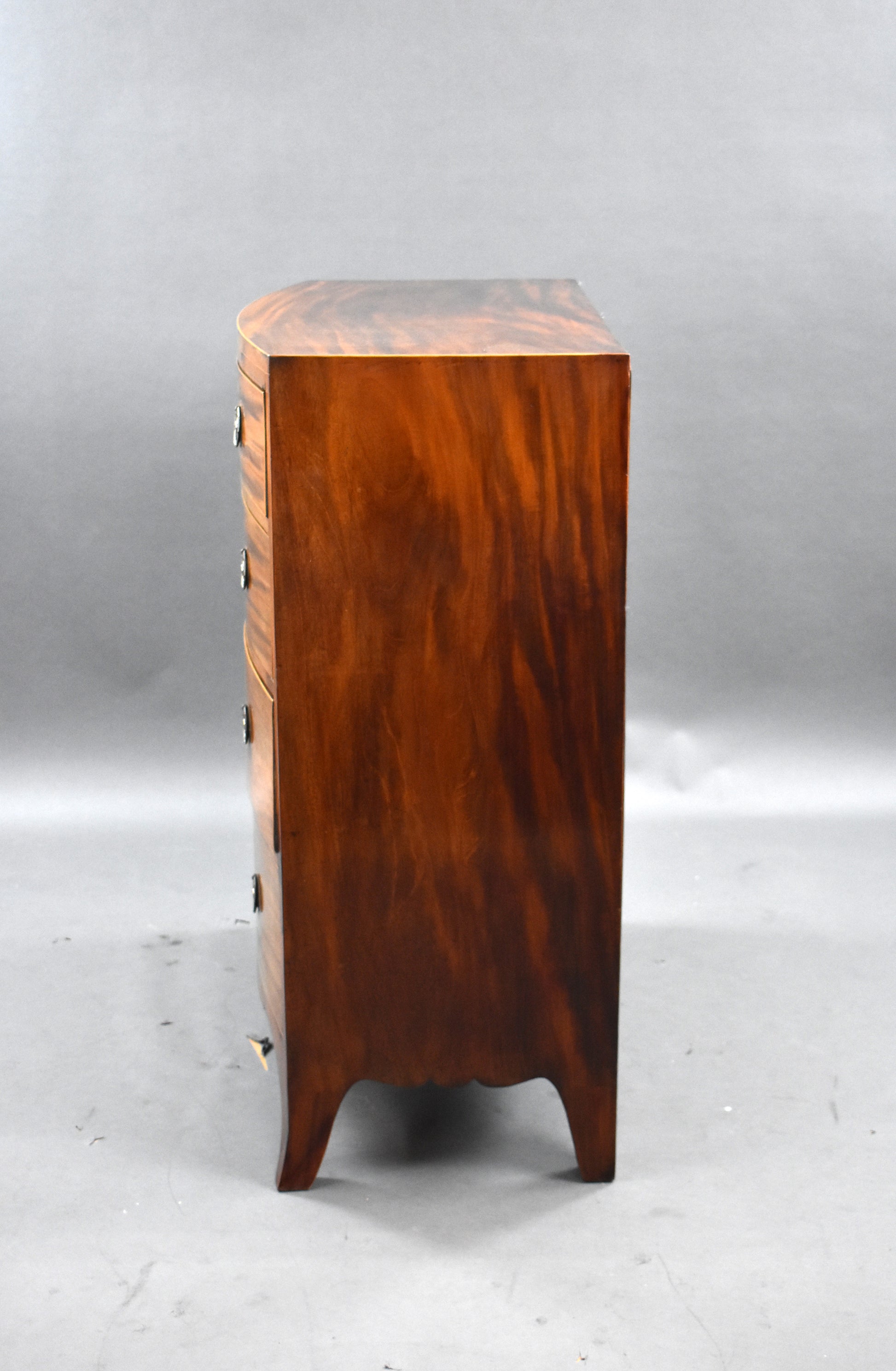 Victorian Mahogany Bowfront Chest Drawers with two small drawers to the top and threee long drawers below all with brass drop handles. The chest has a decorative apron to the bottom standing on splayed feet.