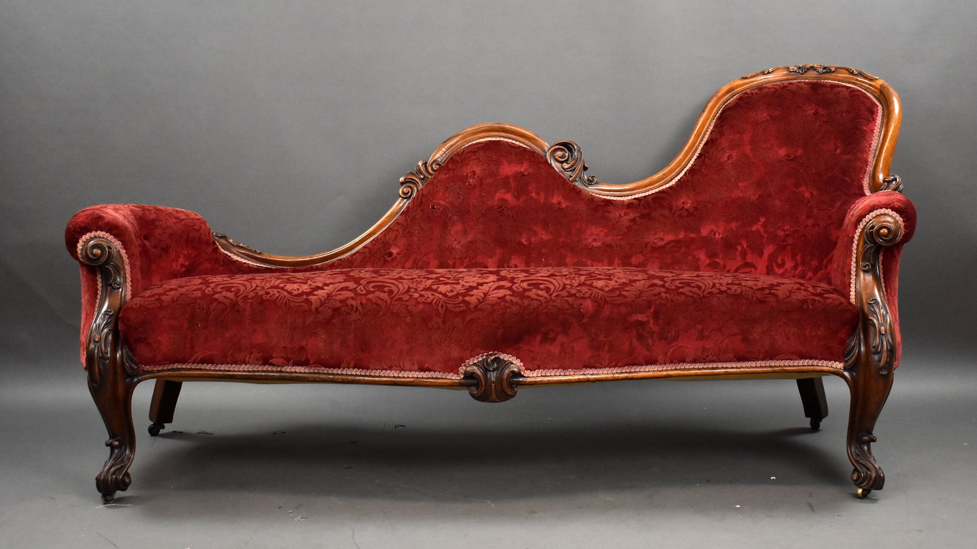Victorian mahogany serpentine chaise upholstered in a red floral fabric with buttoned back, raised on cabriol legs with castors.