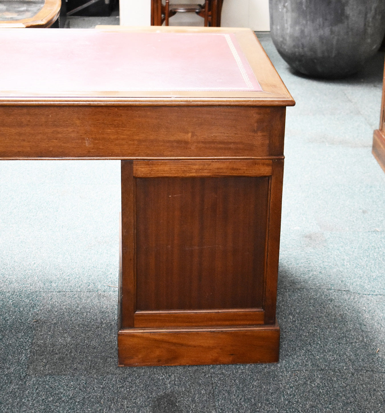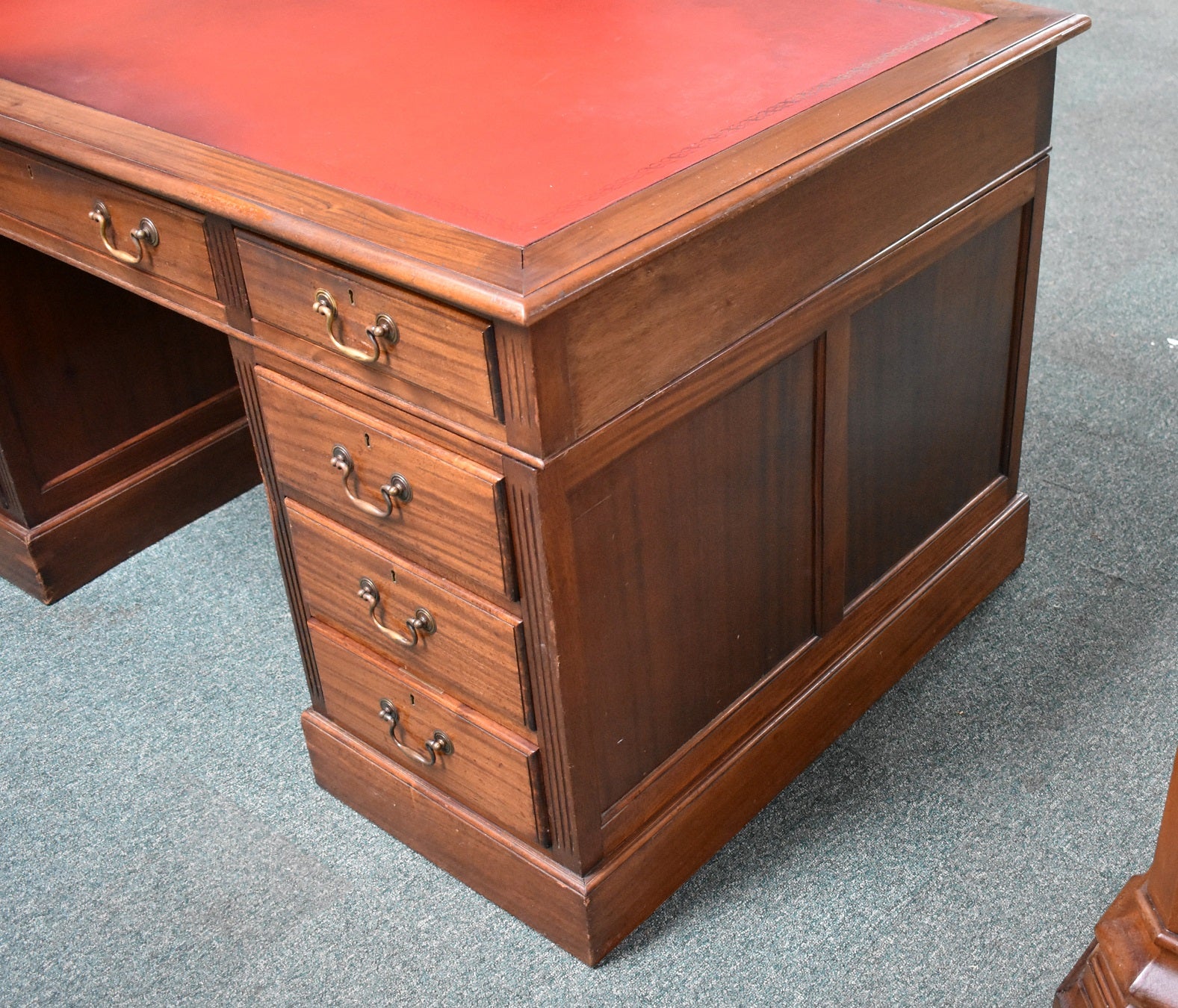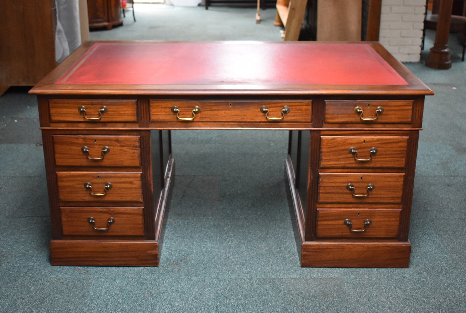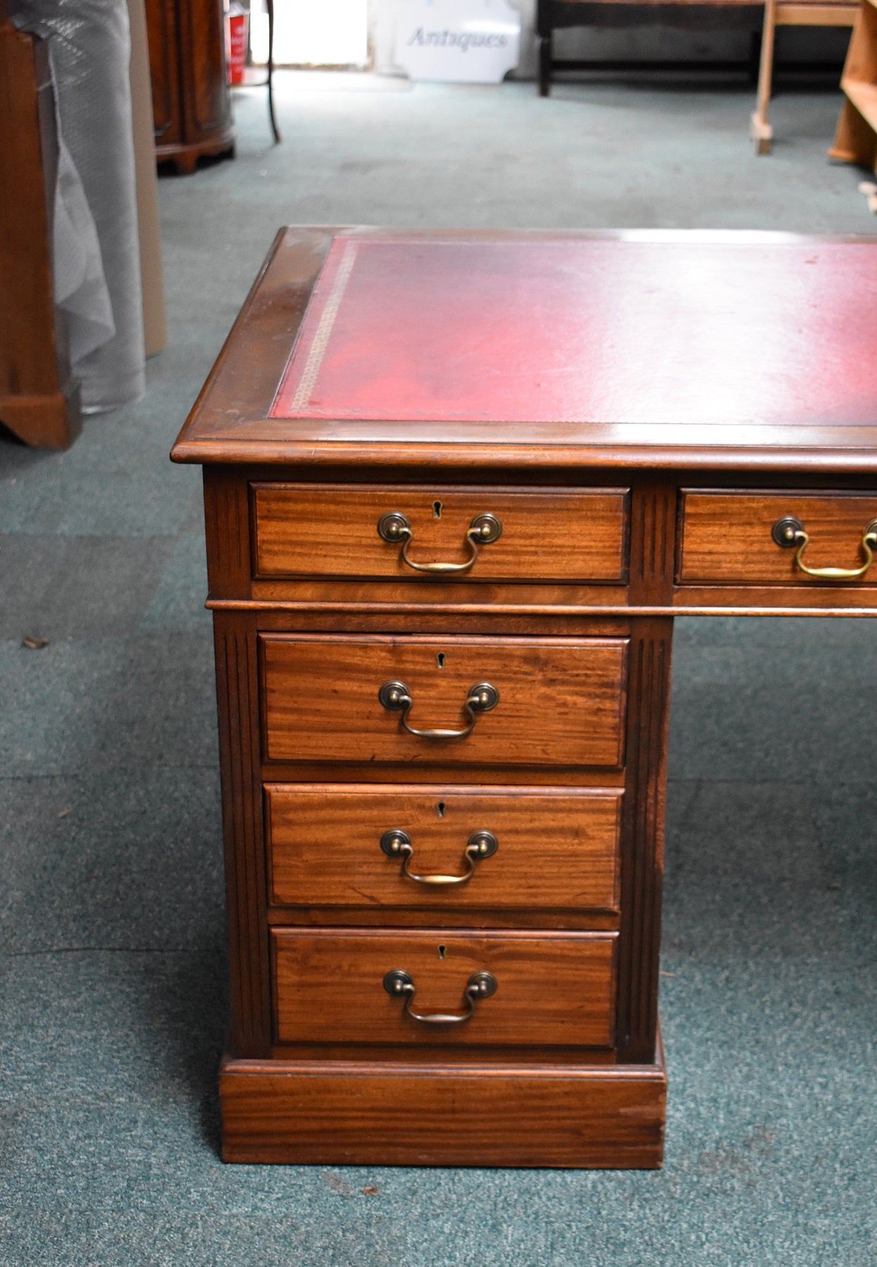 Offered for sale is this Victorian antique mahogany desk with red leather gold tooled top, two short and one long centre drawer to the top and three short either side, all with drop handles.