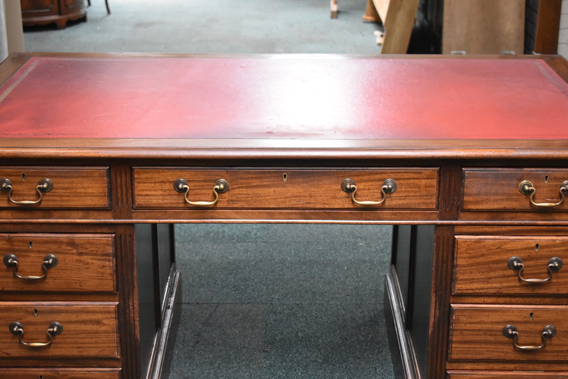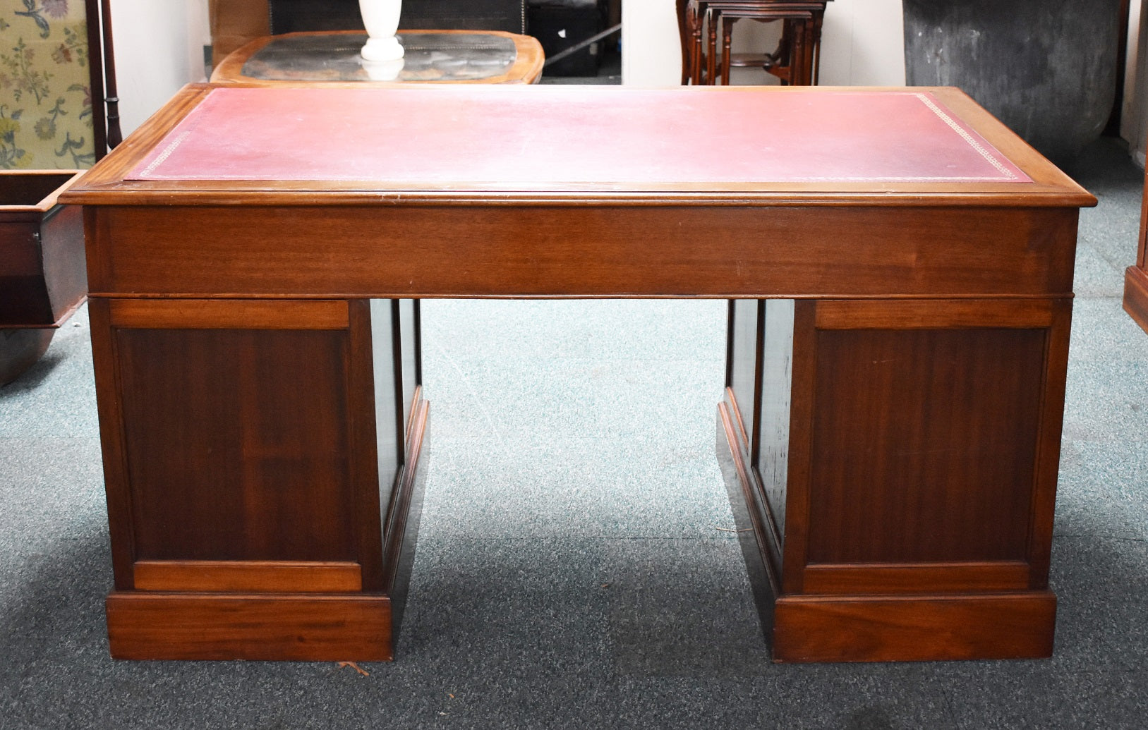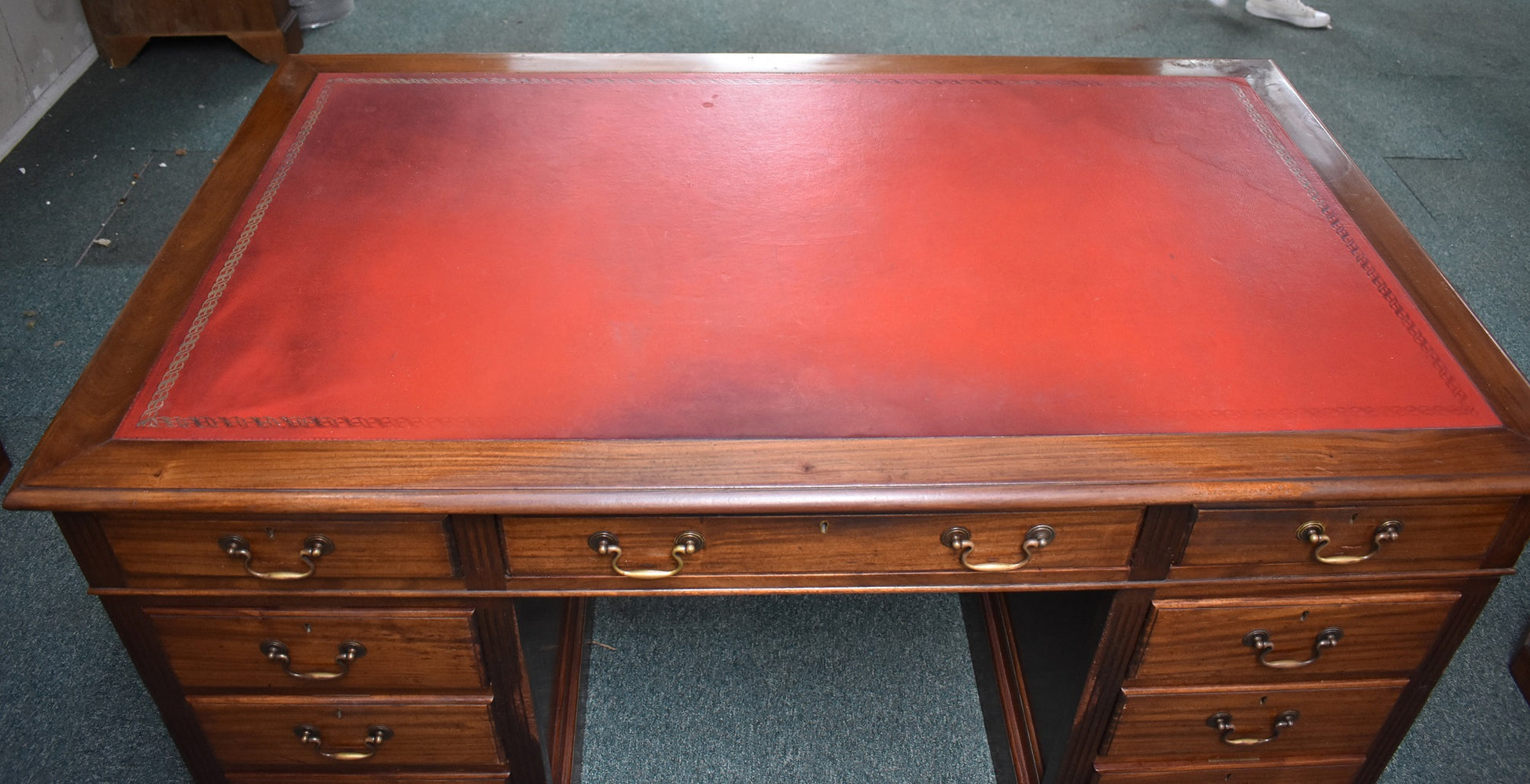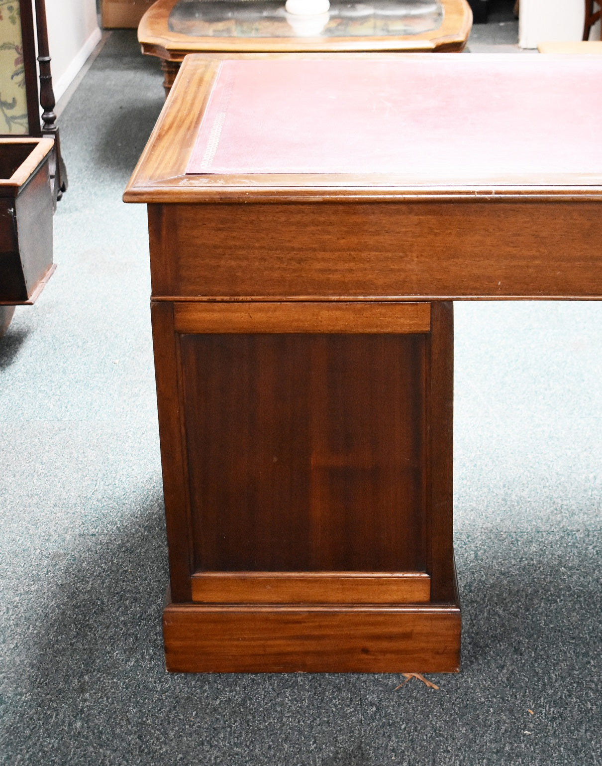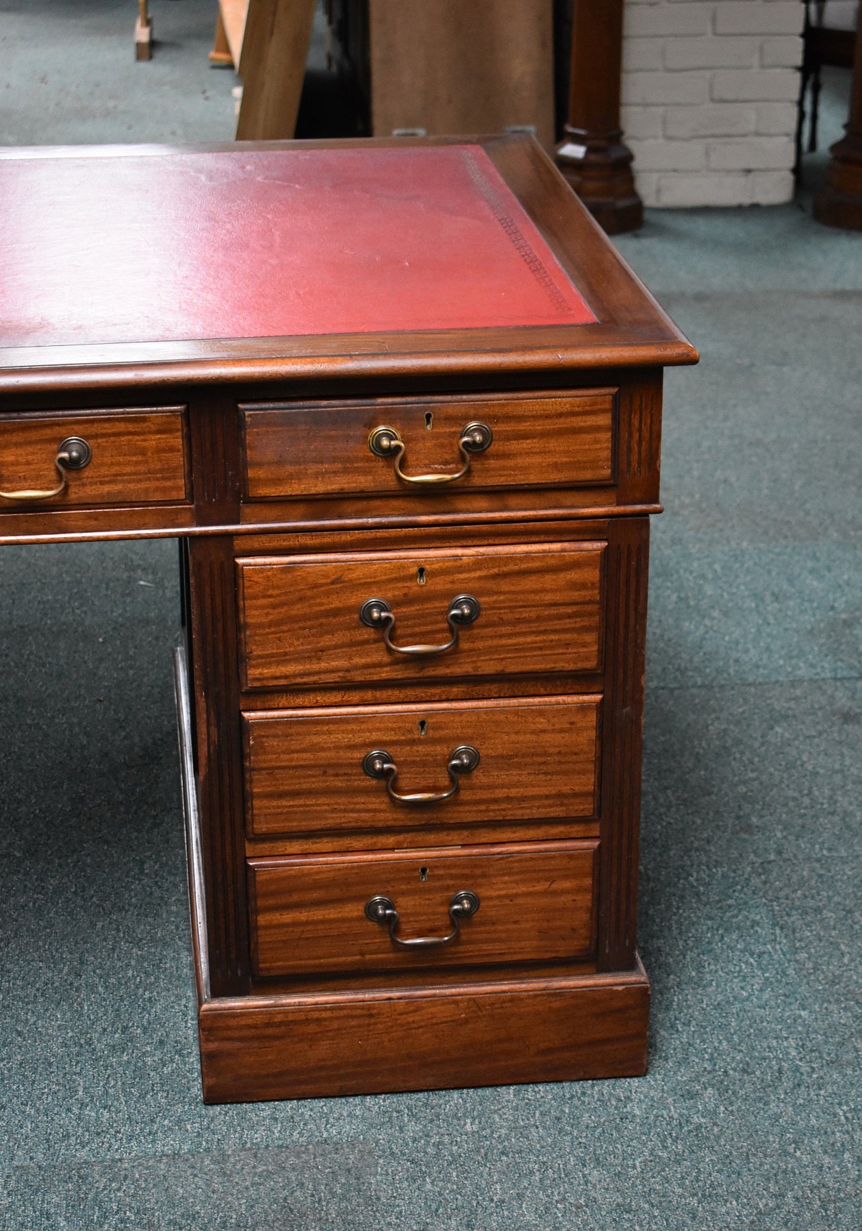 Offered for sale is this Victorian antique mahogany desk with red leather gold tooled top, two short and one long centre drawer to the top and three short either side, all with drop handles.