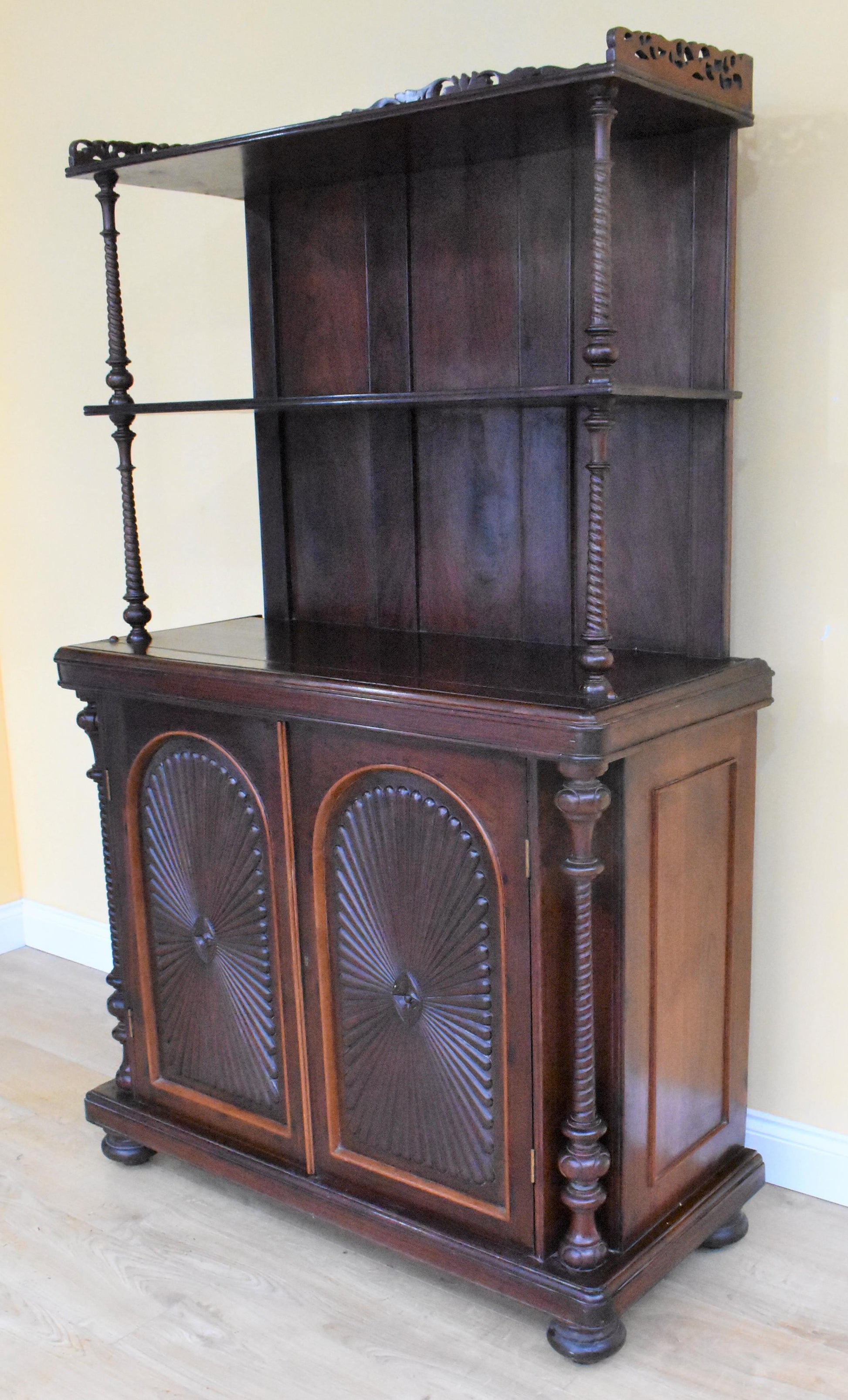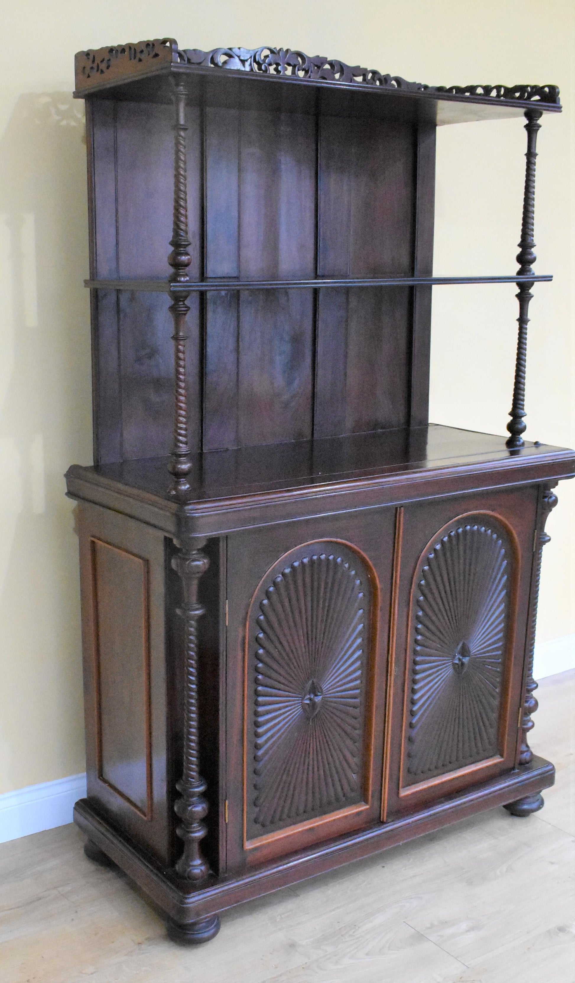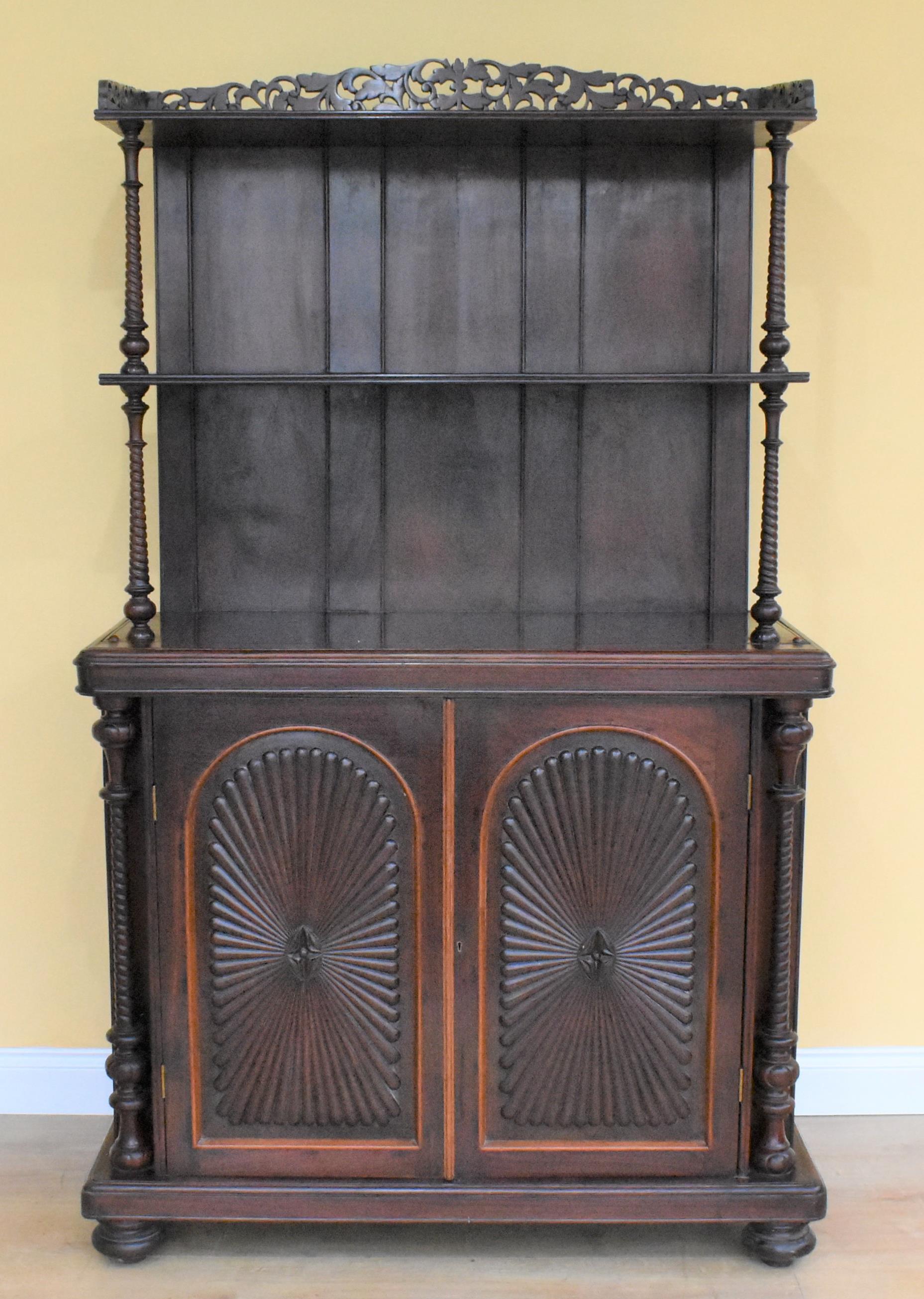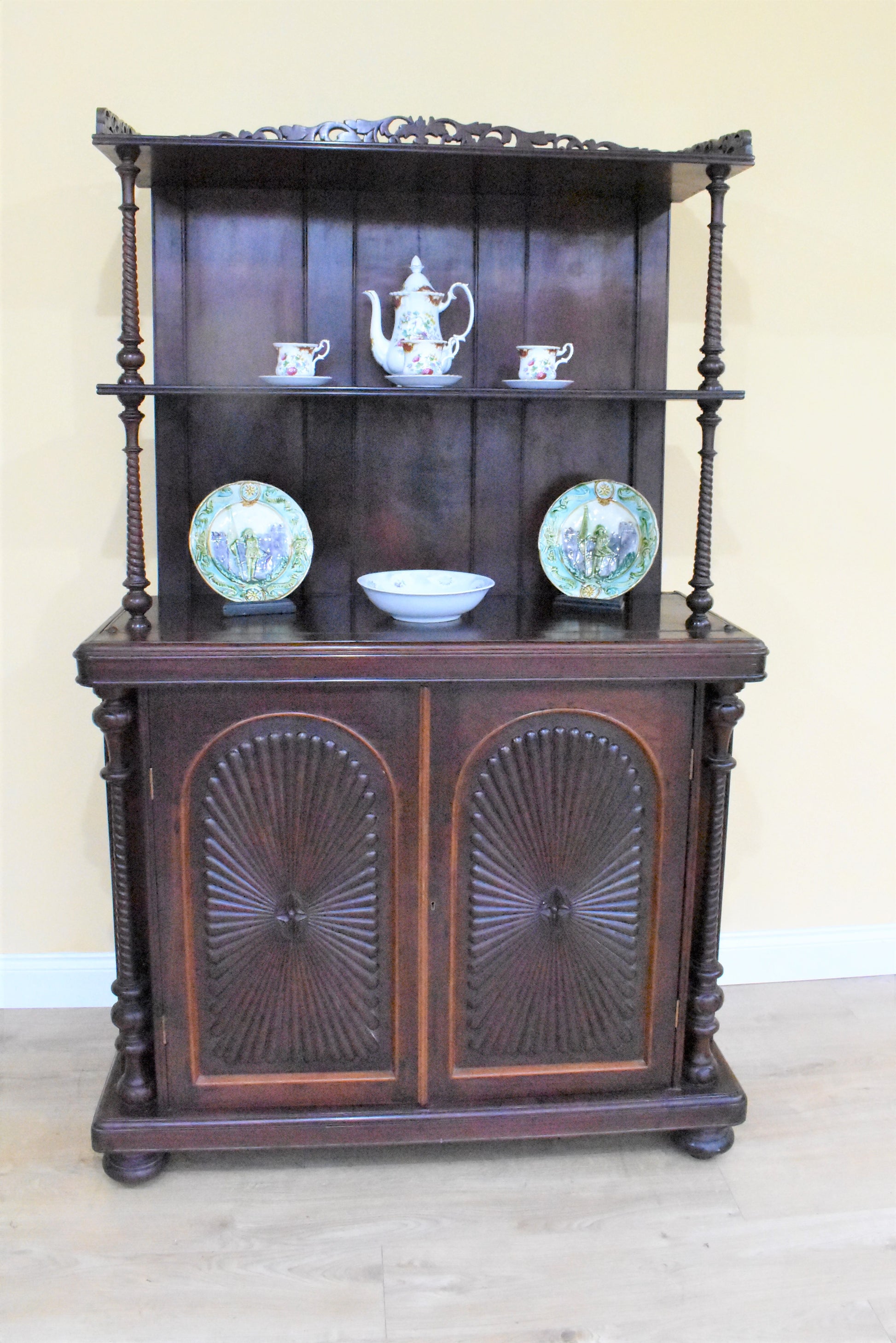 Victorian Rosewood Dresser/cupboard with nice fretwork to the top supported by turned colums with shelf, below decorative cupboard doors enclosing a single removable shelve standing on bun feet. Ring marks to the top and small piece missing to the top left back.