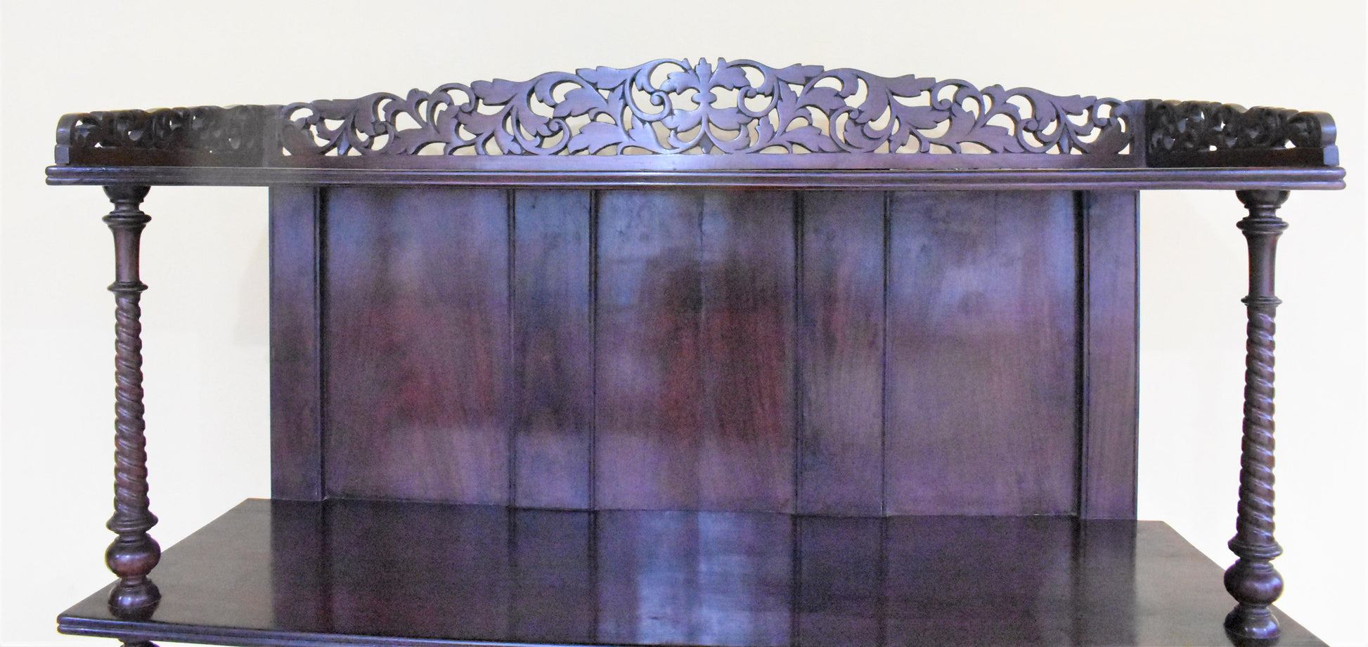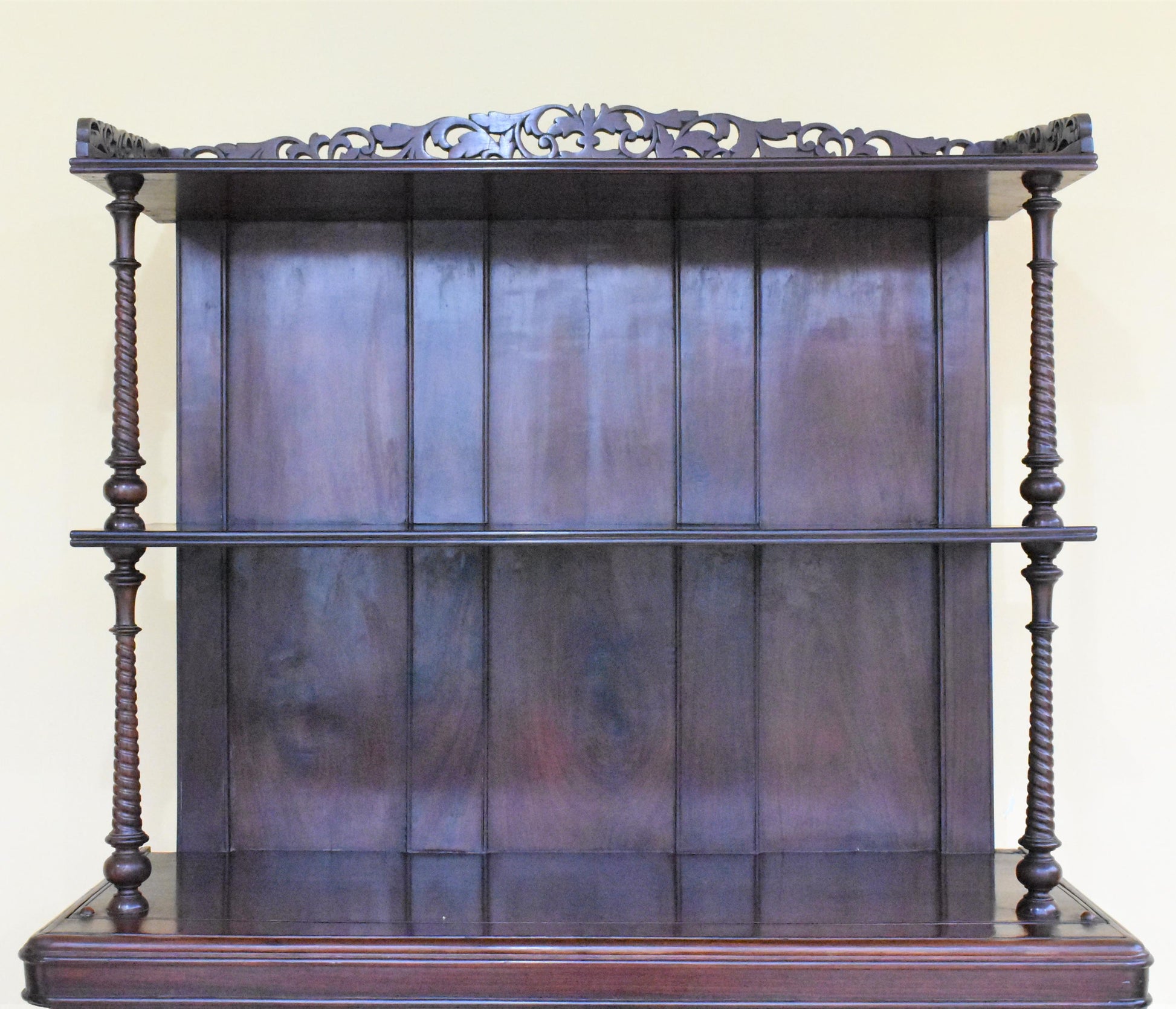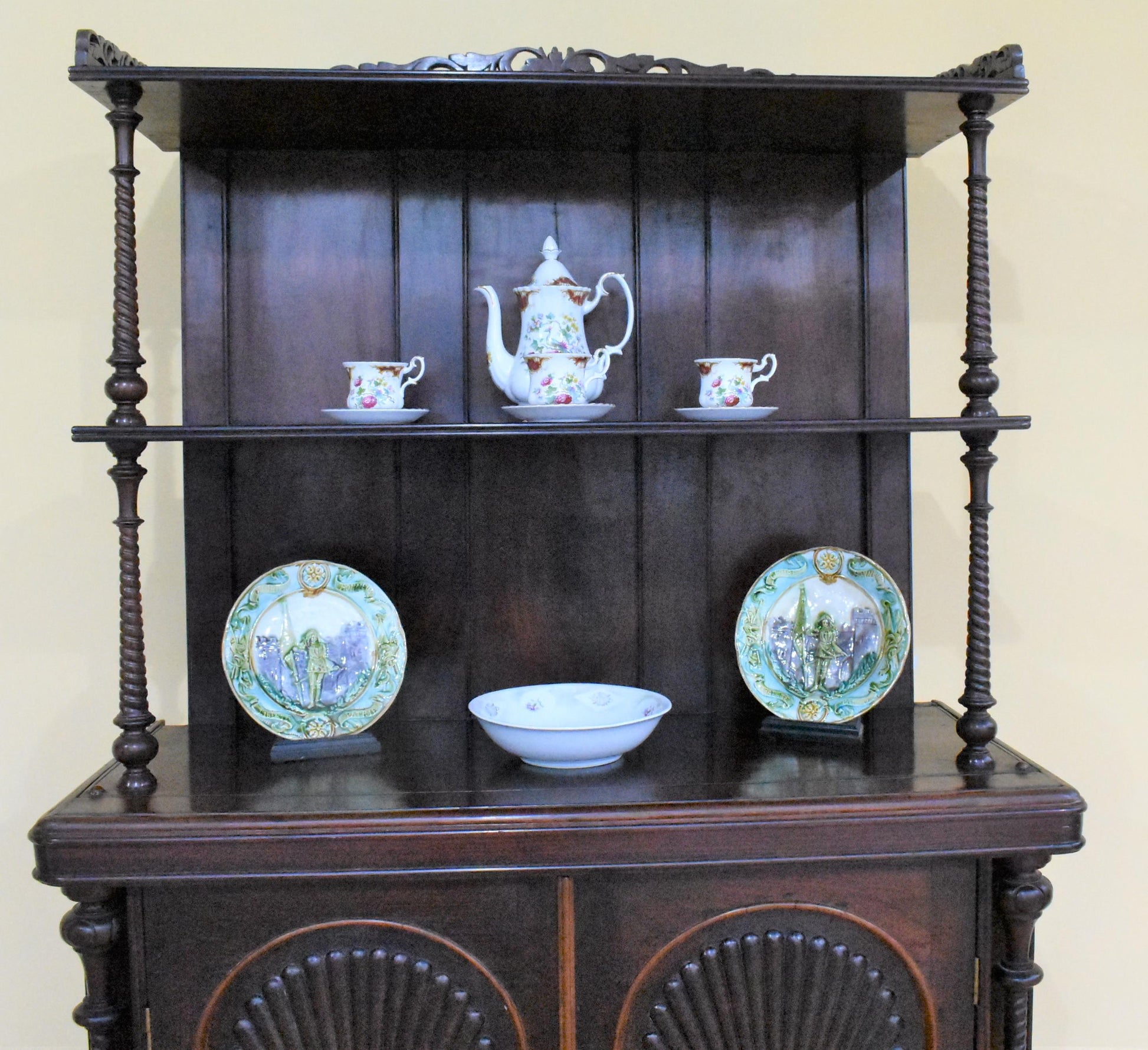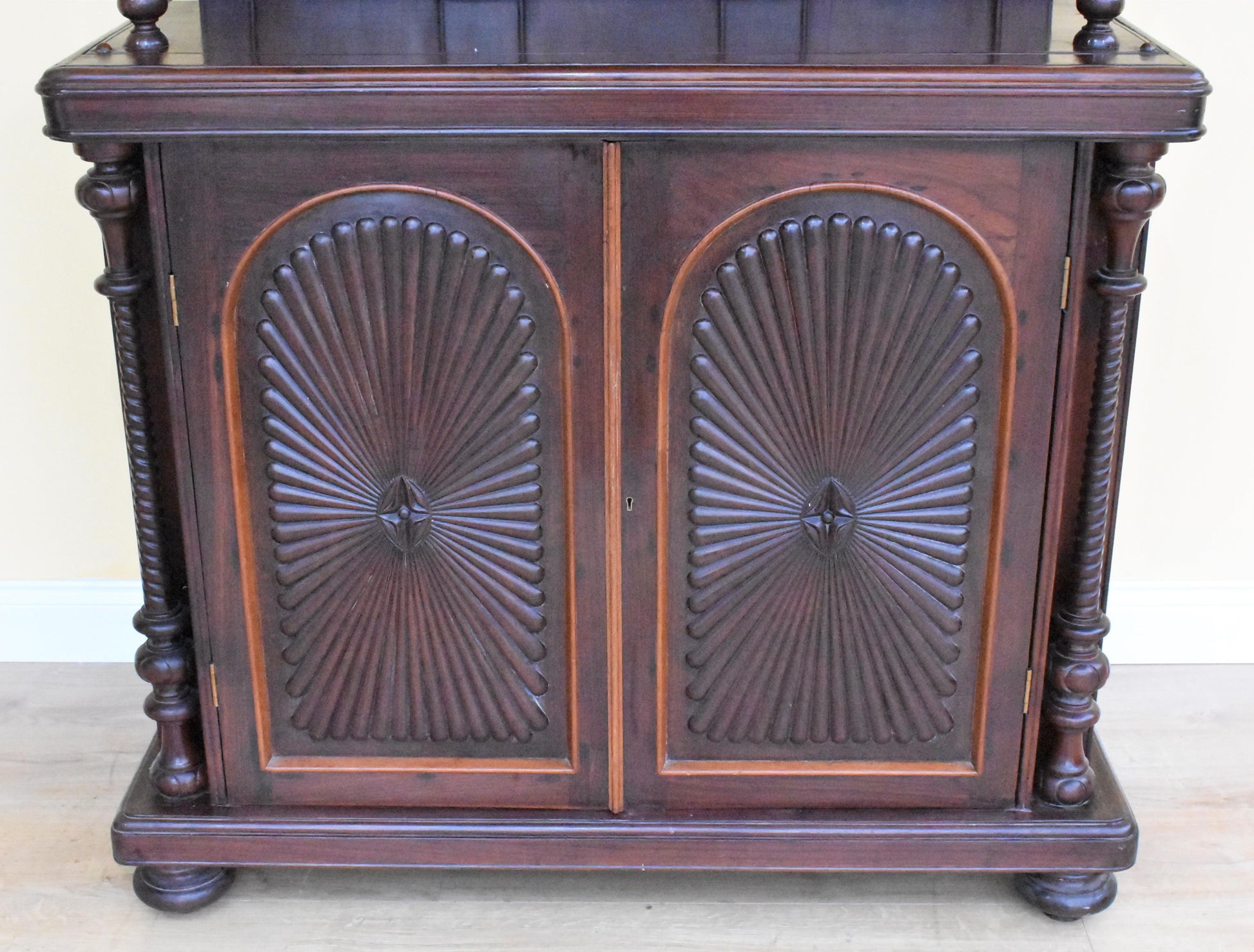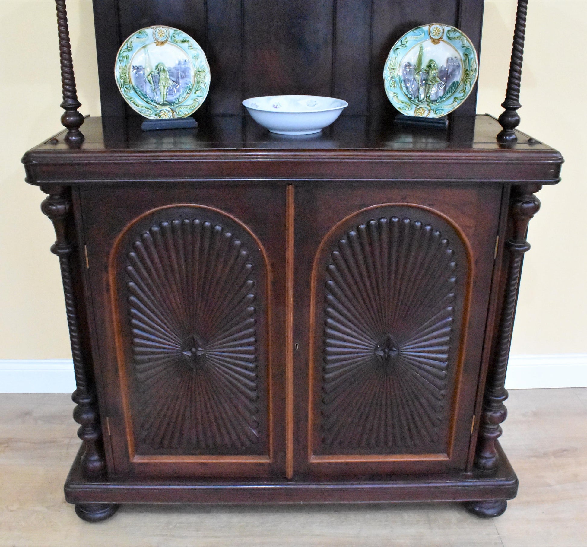 Victorian Rosewood Dresser/cupboard with nice fretwork to the top supported by turned colums with shelf, below decorative cupboard doors enclosing a single removable shelve standing on bun feet. Ring marks to the top and small piece missing to the top left back.