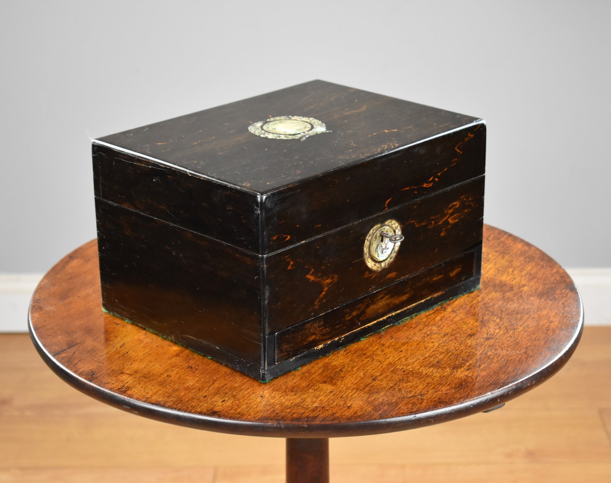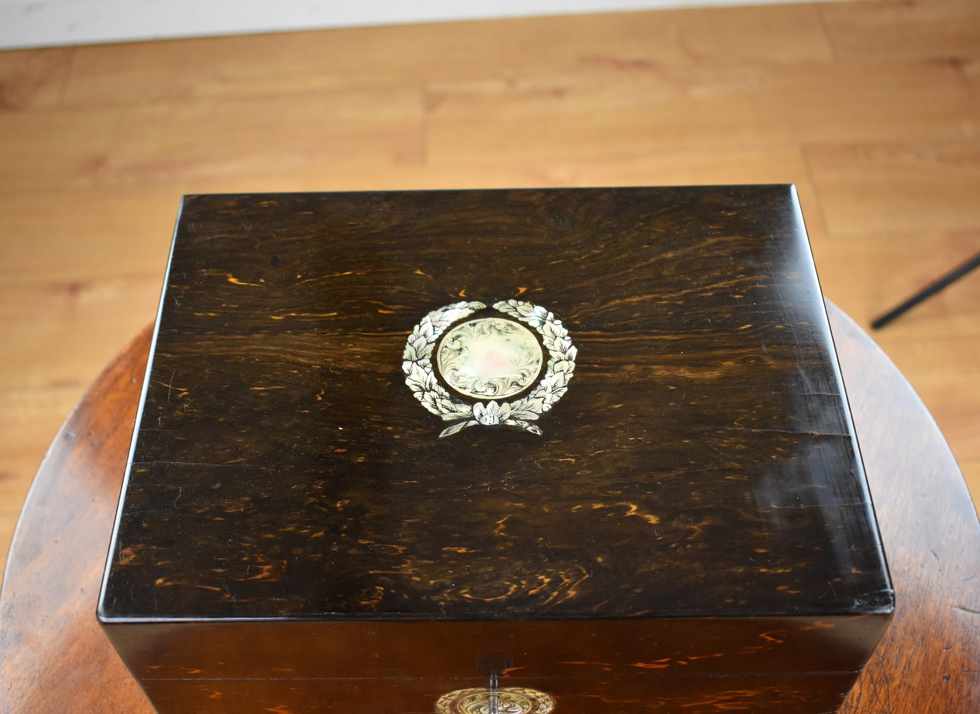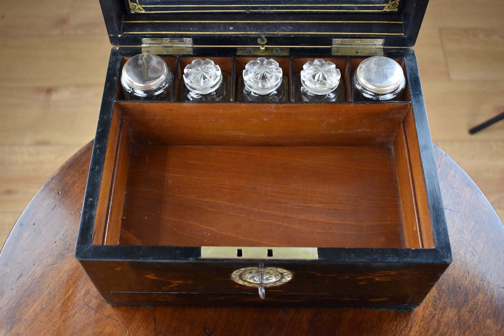 Victorian rosewood travelling vanity box / jewellery case. The top has an inlaid mother of pearl floral motif and mother of pearl surrounding the lock.