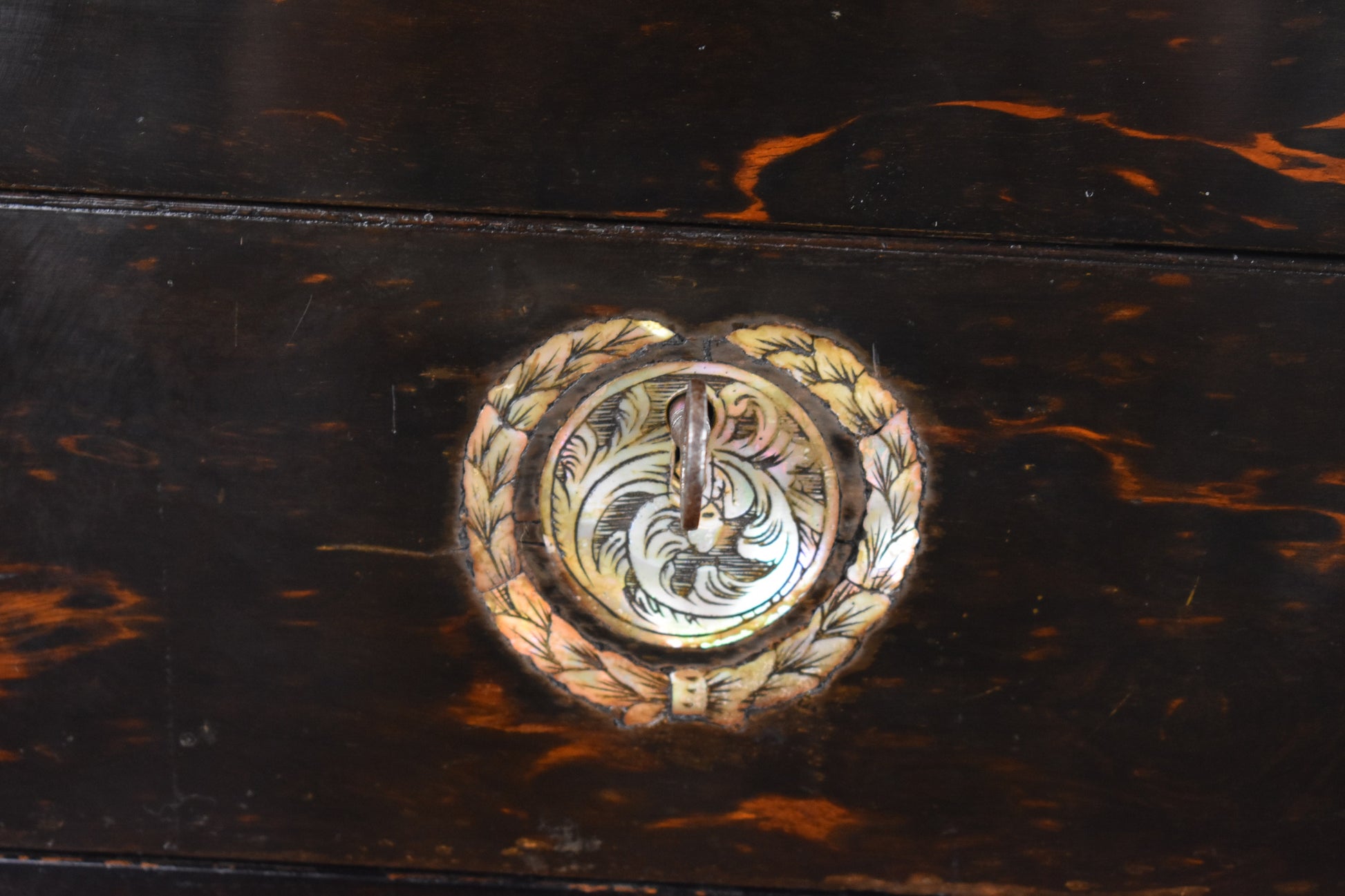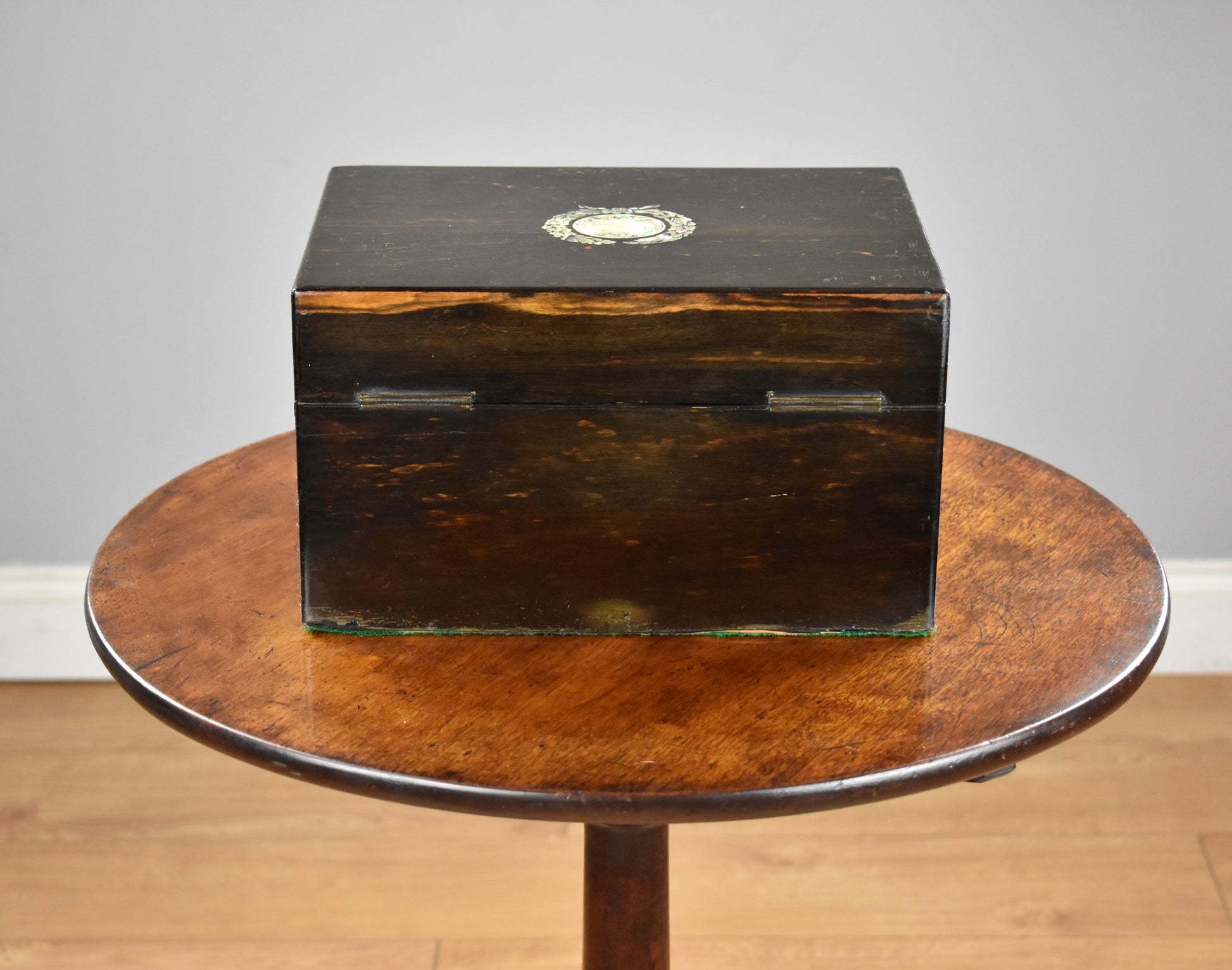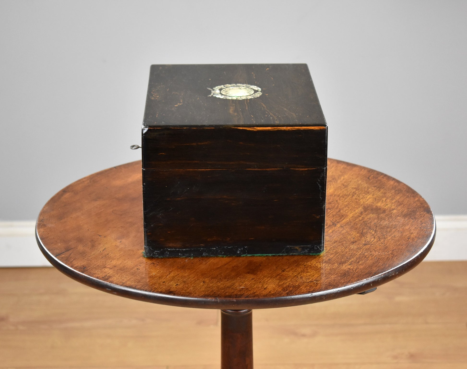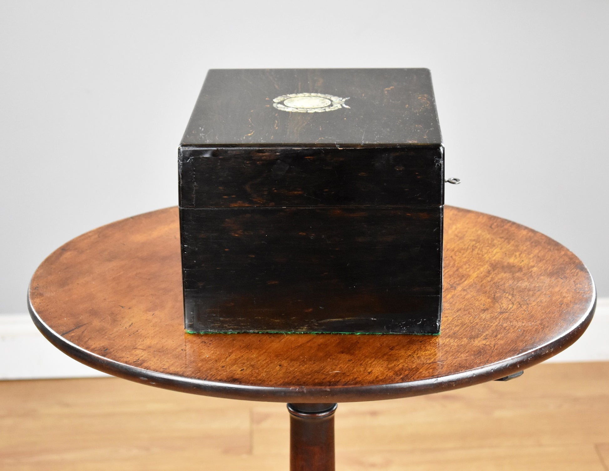 Victorian rosewood travelling vanity box / jewellery case. The top has an inlaid mother of pearl floral motif and mother of pearl surrounding the lock.