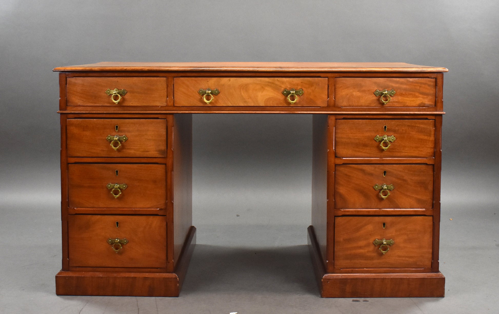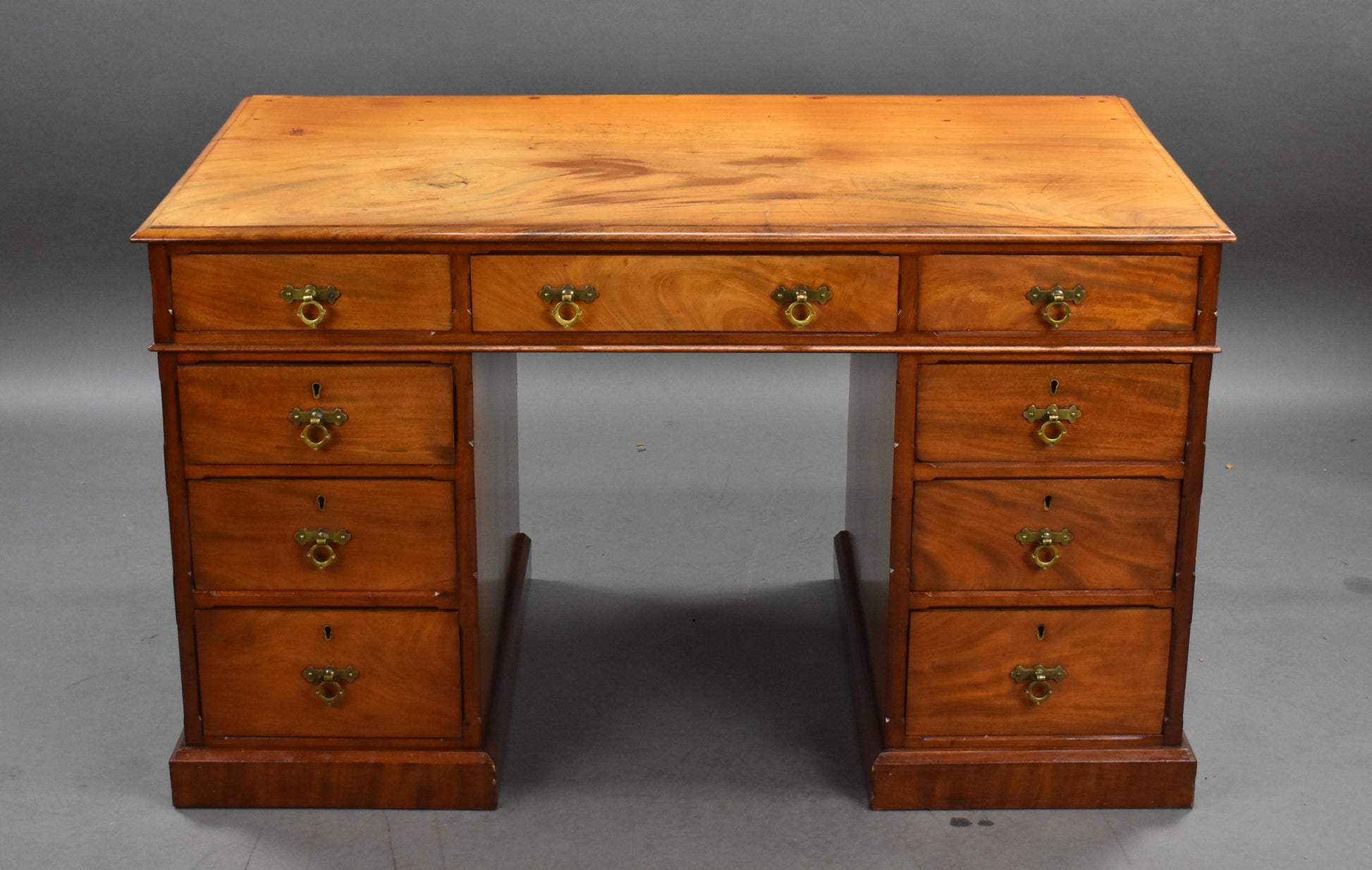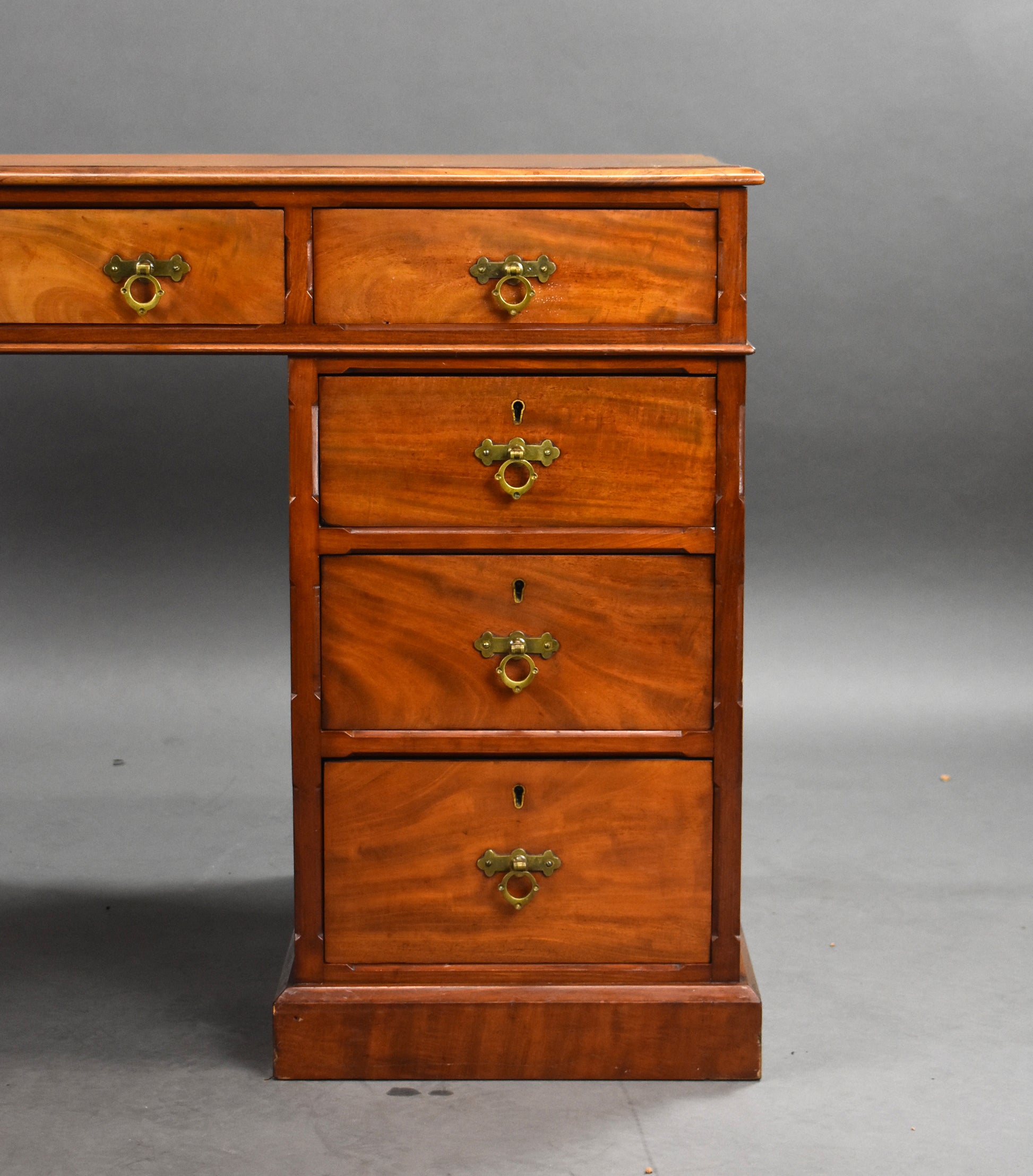 For sale is a good quality Victorian satinwood pedetal desk, having a polished top, above three drawers, each with brass handles. The top fits on to two pedestals, each with a further three graduated drawers and original brass handles. The desk is raised on a plinth base and remains in very good condition, showing minor signs of wear commensurate with age and use.